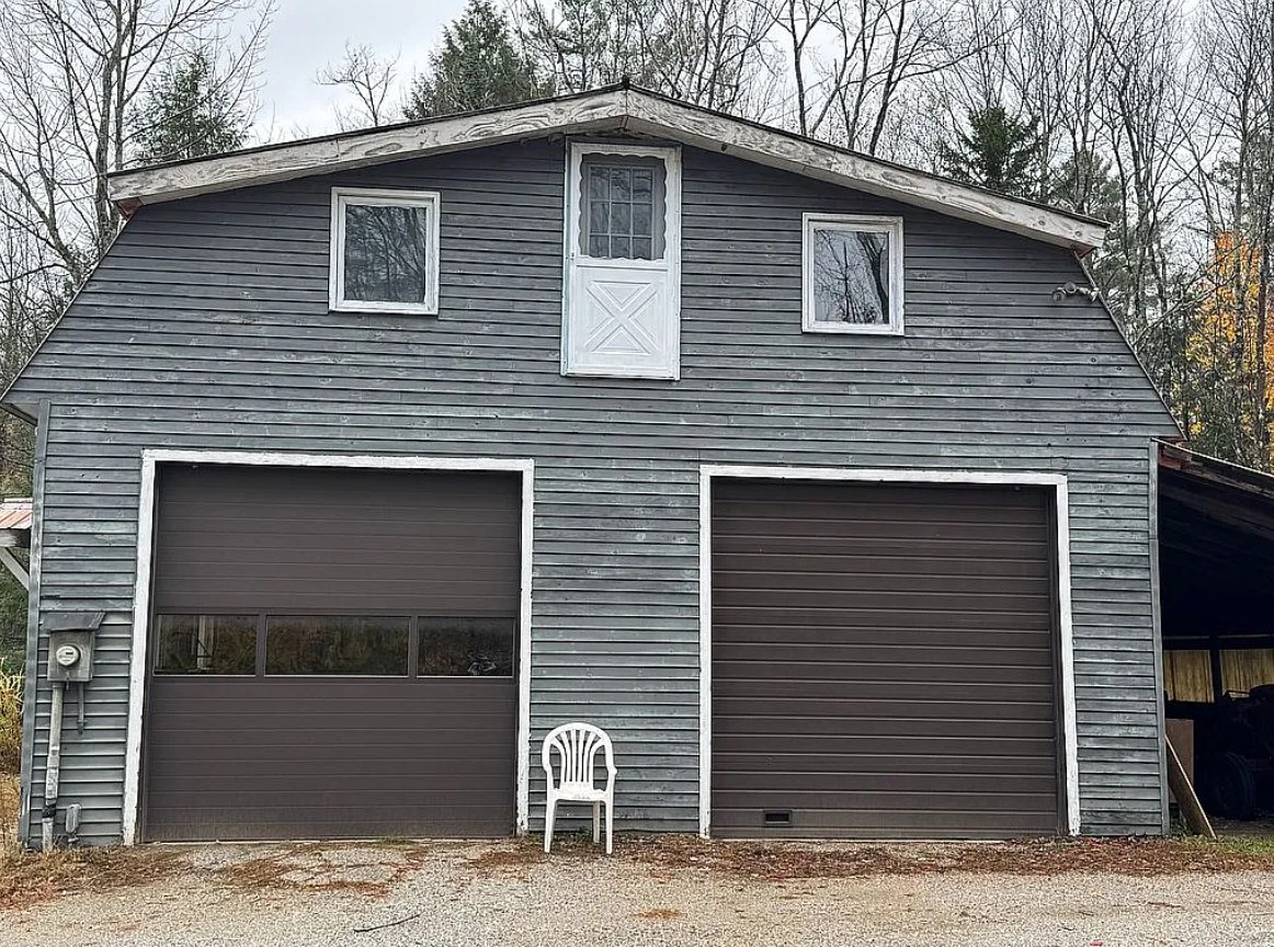 This property features a spacious work garage equipped with oversized doors, a wall-mounted heater, and a lift in one bay ideal for car enthusiasts, mechanics, or hobbyists.