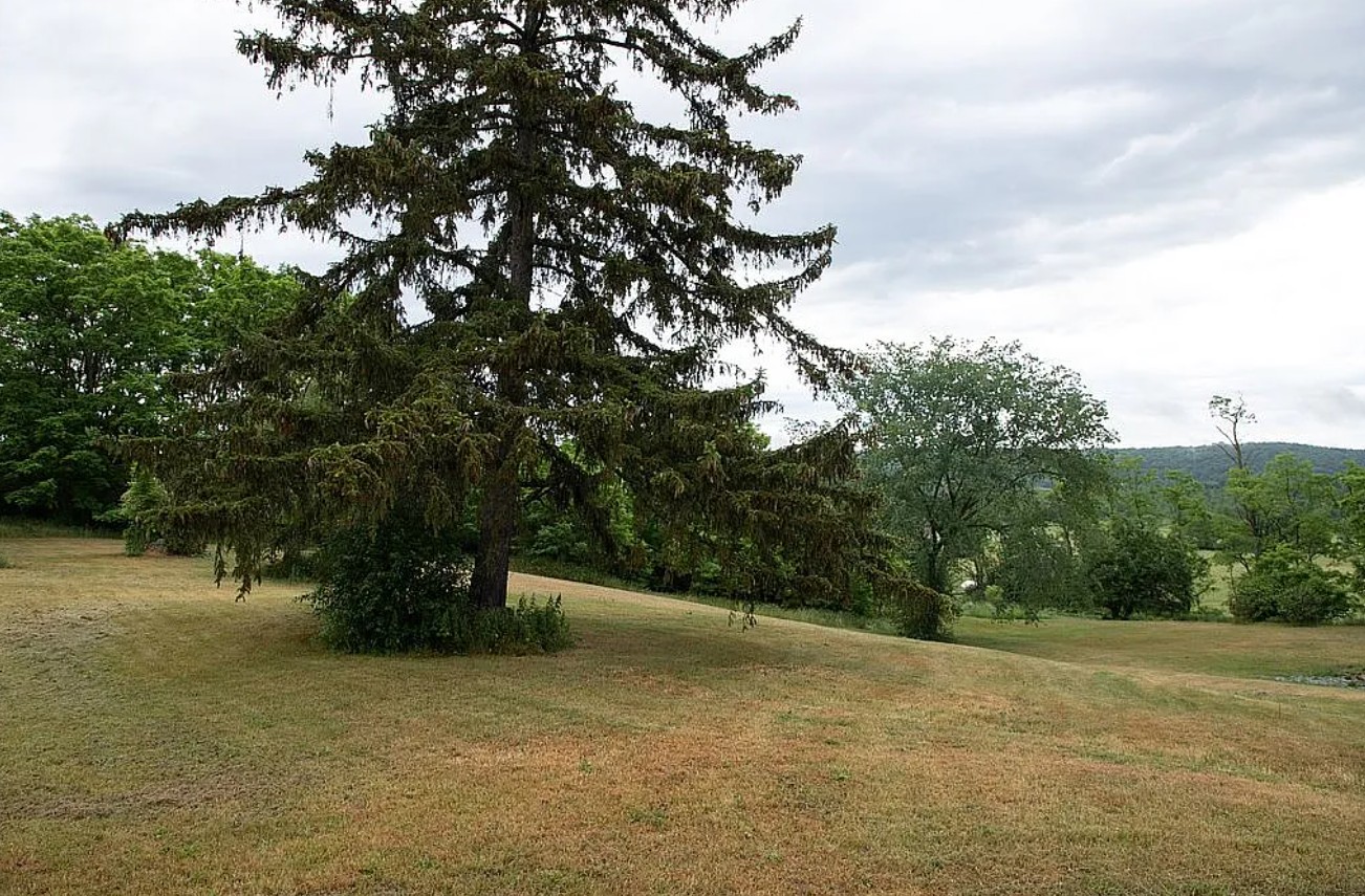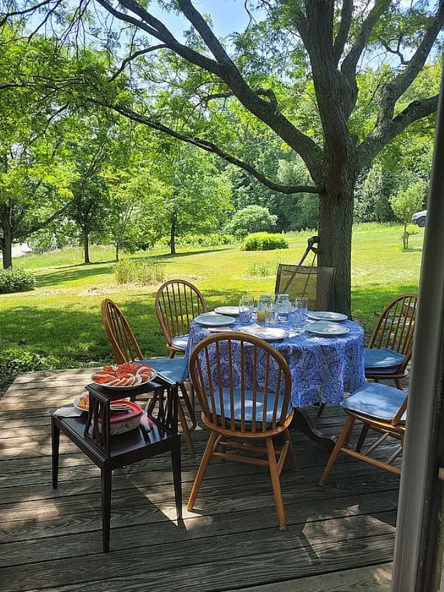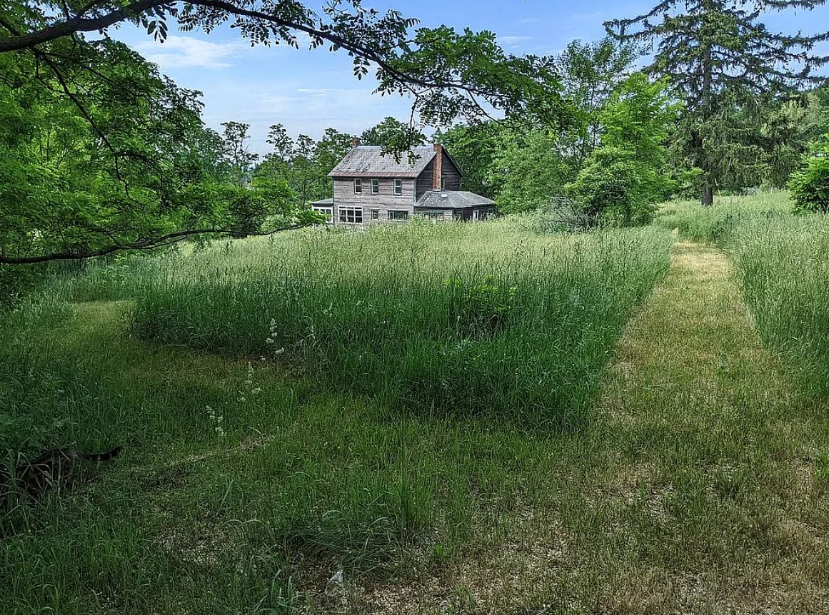 The home sits on a gentle hill above a quiet dirt road, offering beautiful views, an east-facing porch for morning sun, and a large backyard ideal for gardening or outdoor enjoyment.