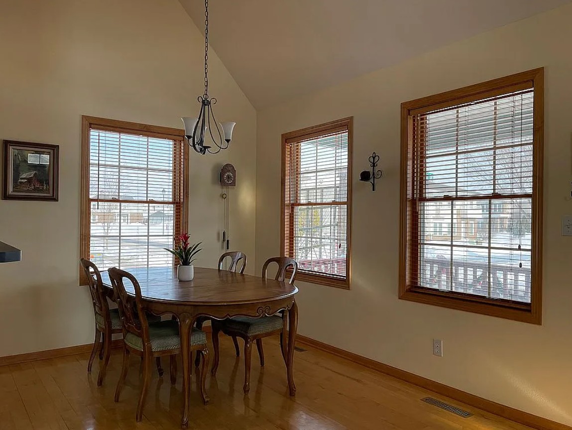 The home’s main level features an open-concept design with a spacious great room boasting vaulted ceilings and eleven large windows that fill the space with natural light.