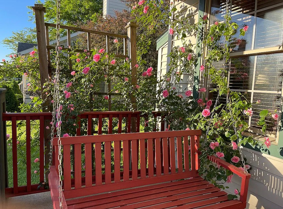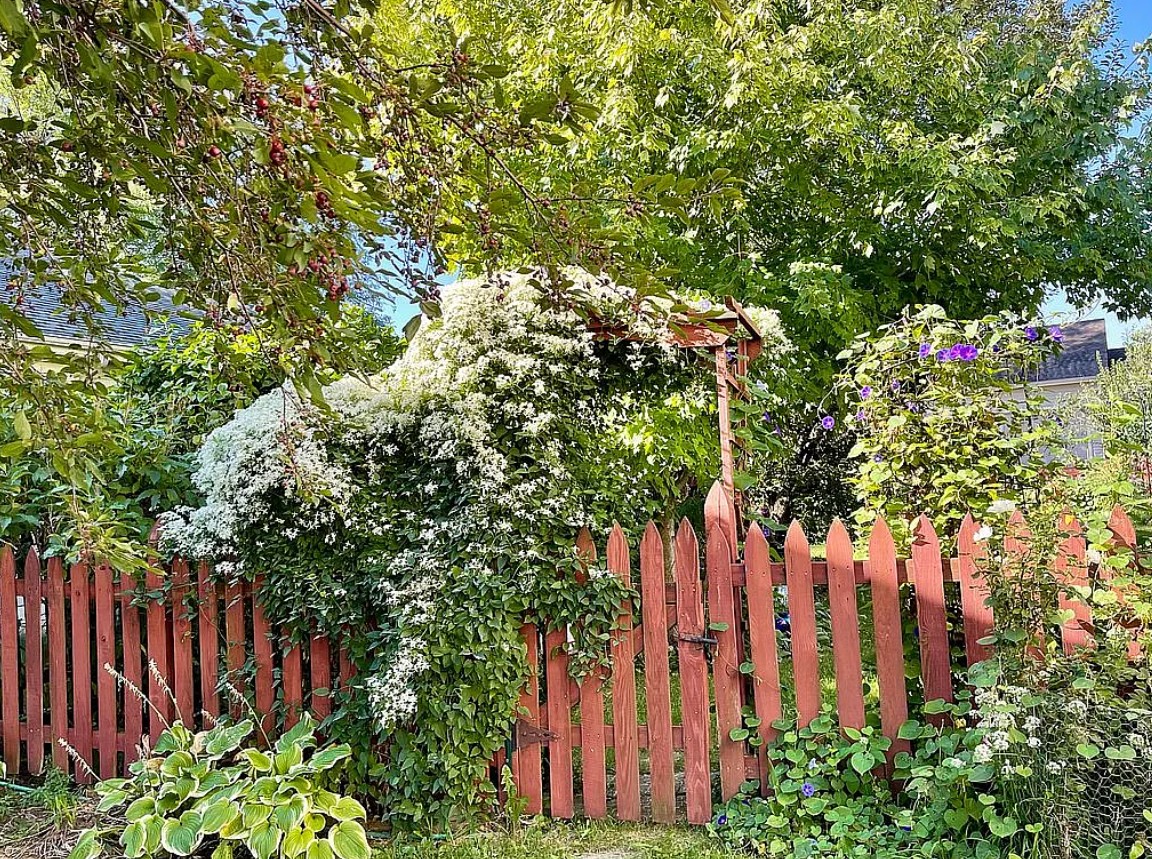 The private fenced backyard features mature landscaping, including lilacs, shrub roses, perennials, and trees such as Black Hills spruce, maple, and flowering crabapple.