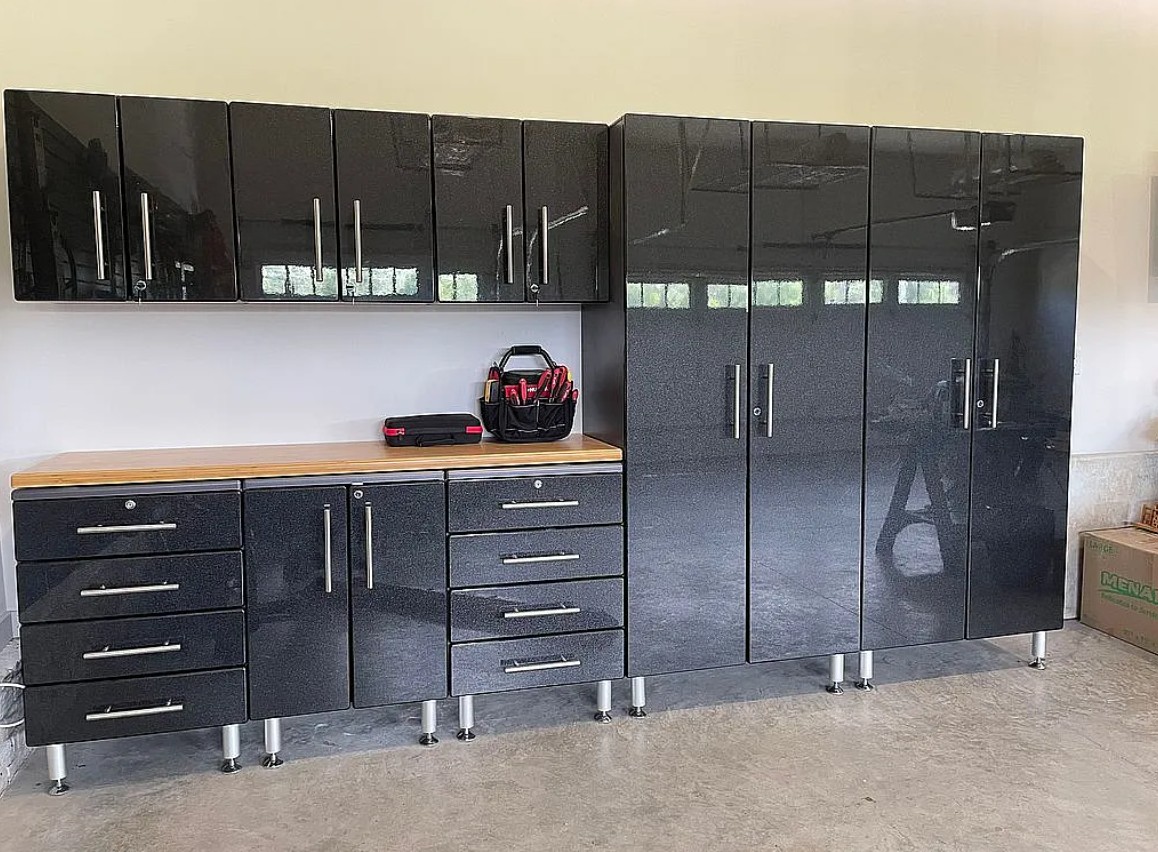 The 3 car insulated garage includes custom cabinetry, a work surface, slat wall system, and overhead storage racks for maximum organization.