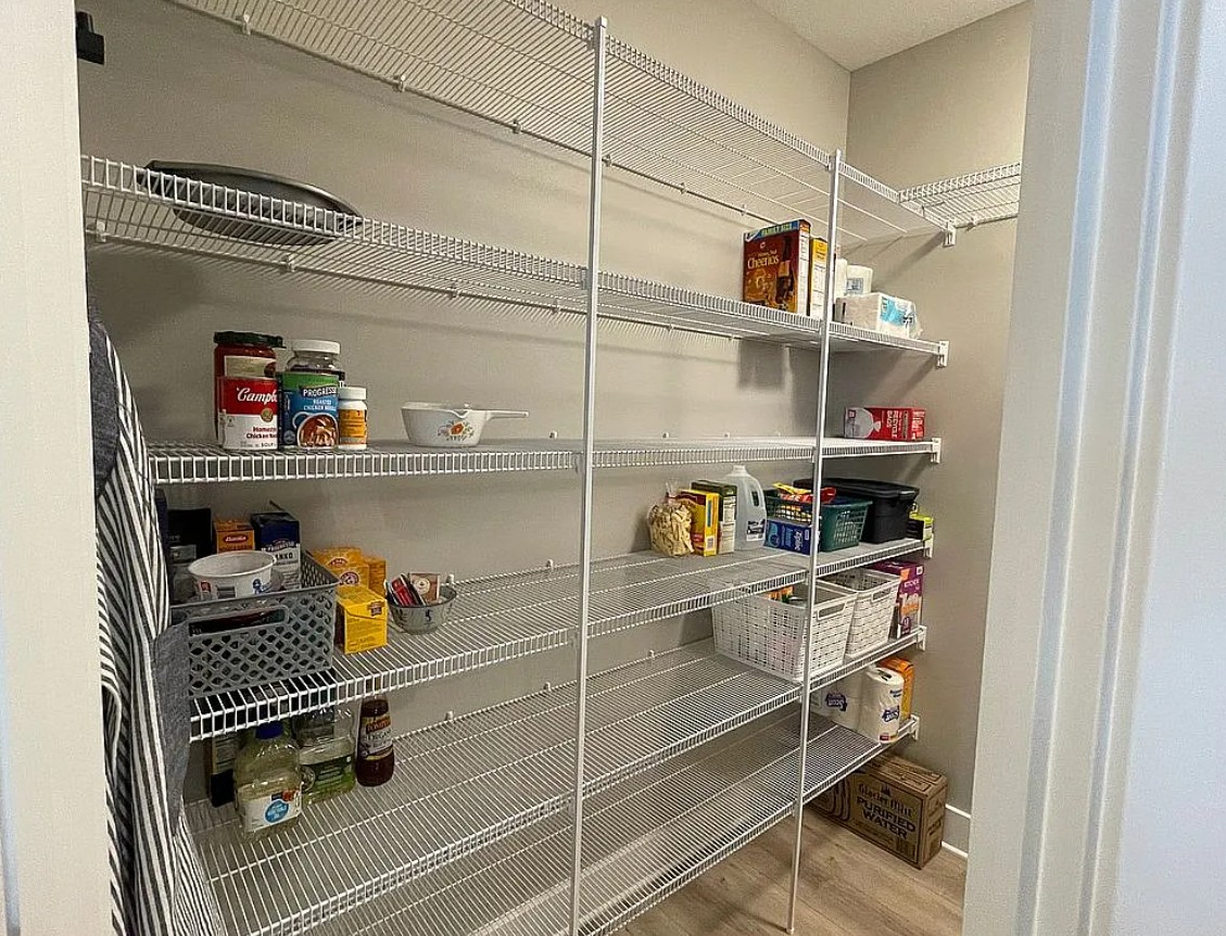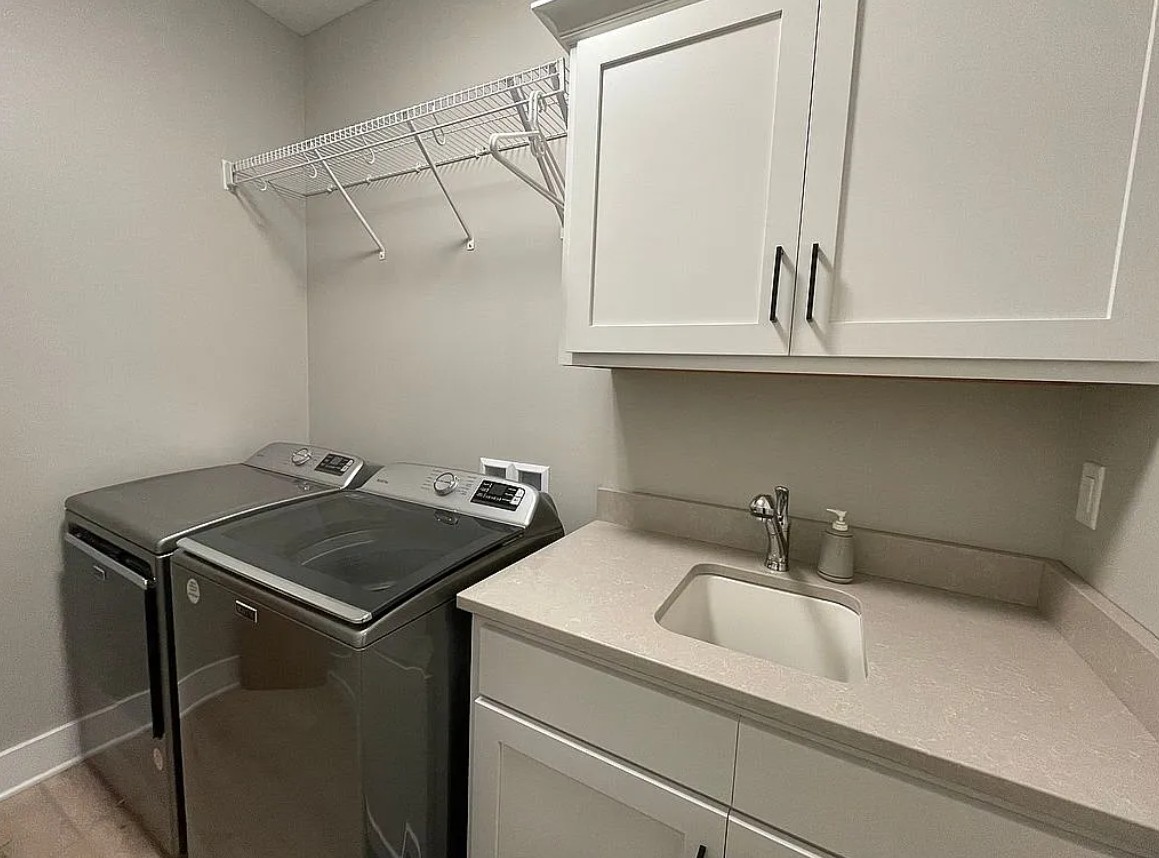 A mudroom with an extra-large “locker” provides organized space for coats, hats, and backpacks, conveniently located near the laundry room, which includes a quartz-topped sink.