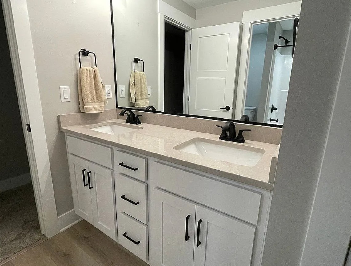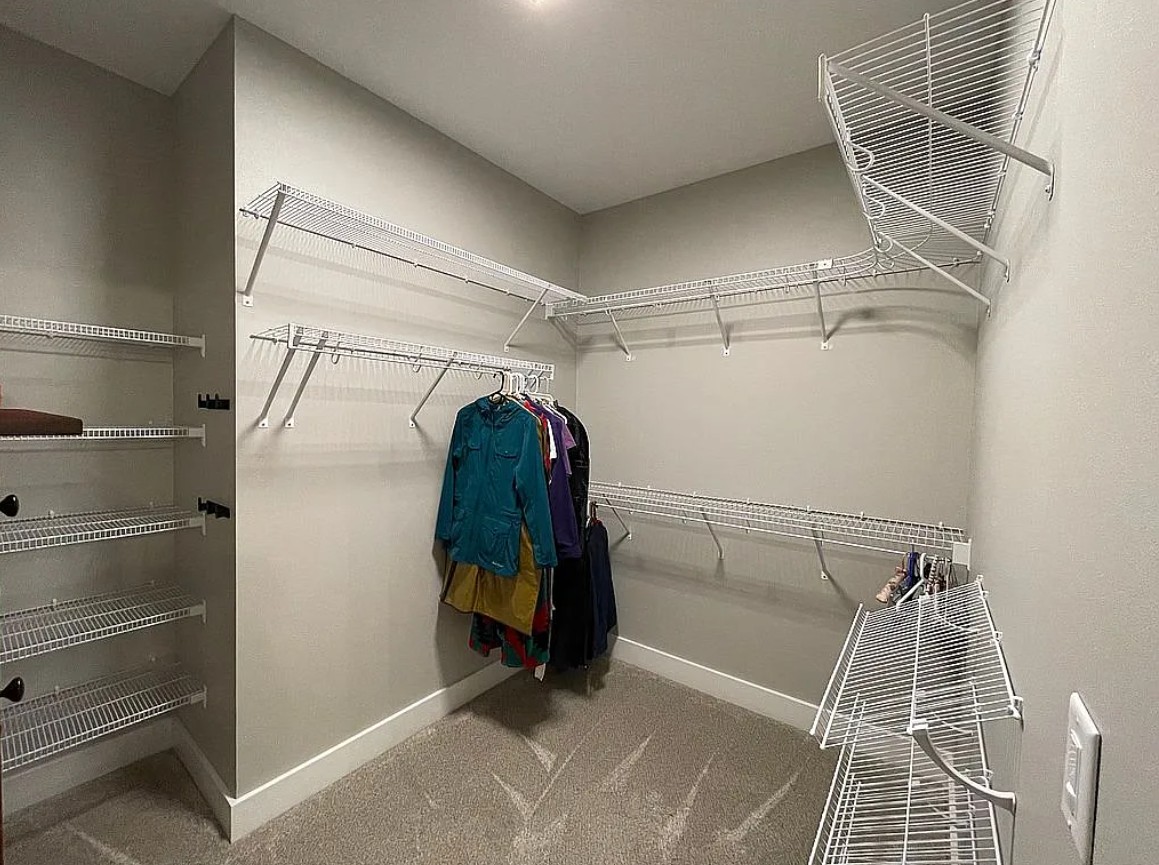The main-floor owner’s suite offers a peaceful retreat with dual vanities, a large walk-in closet, and a linen closet for extra storage.