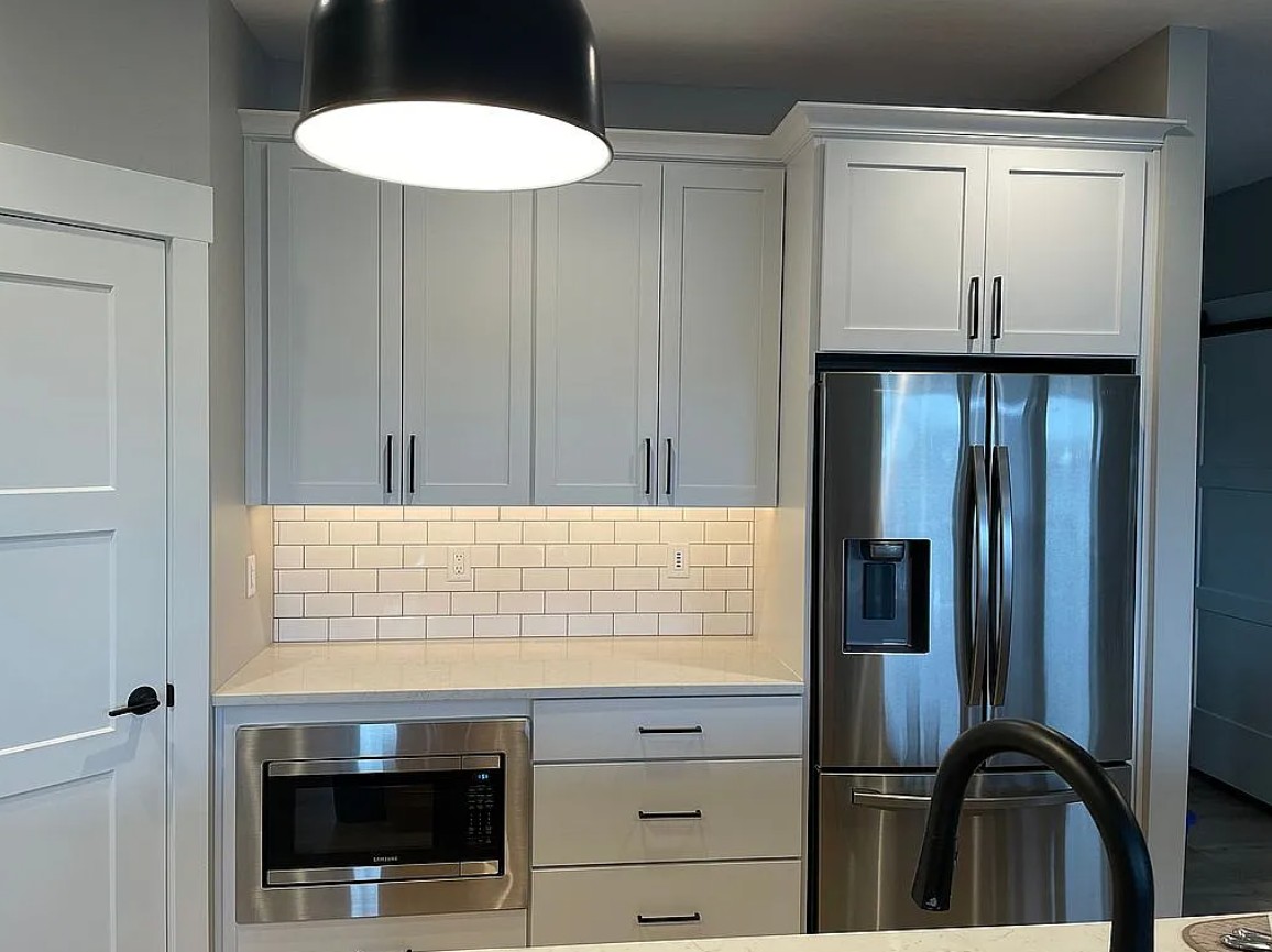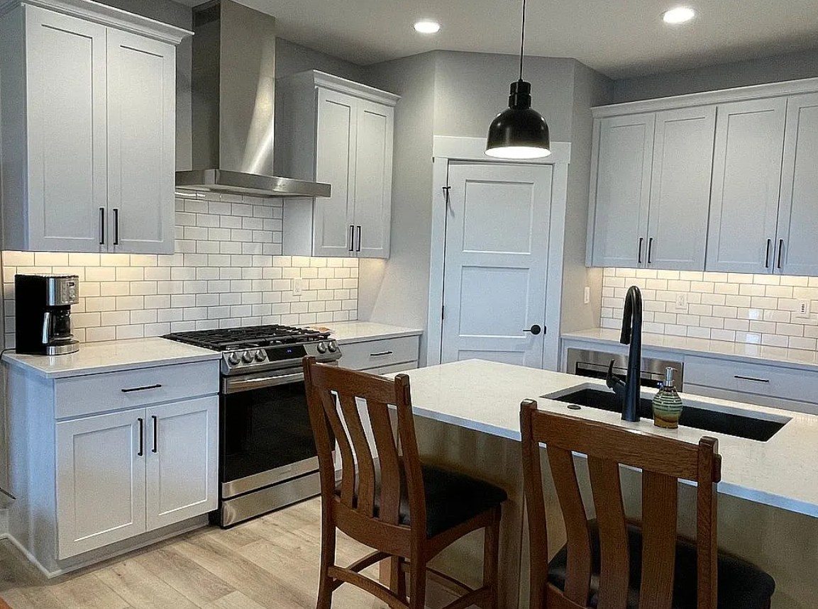 The open concept main floor features a spacious kitchen with white cabinetry, stainless steel appliances, quartz countertops, soft-close drawers, and LED under-cabinet lighting.