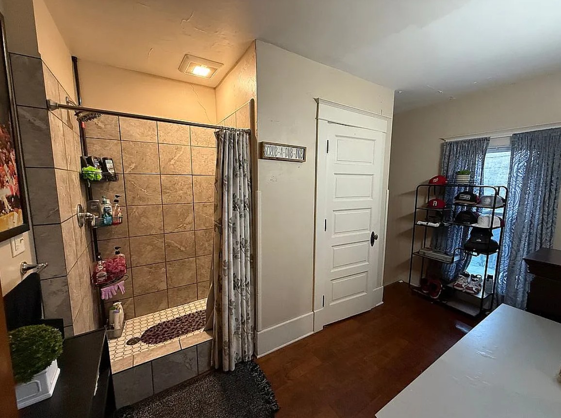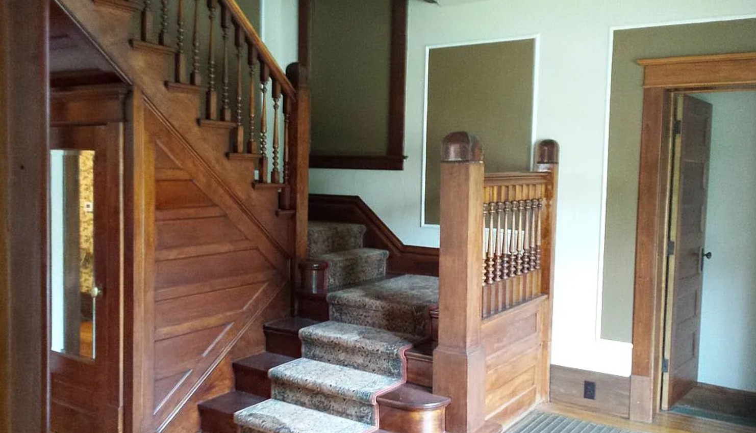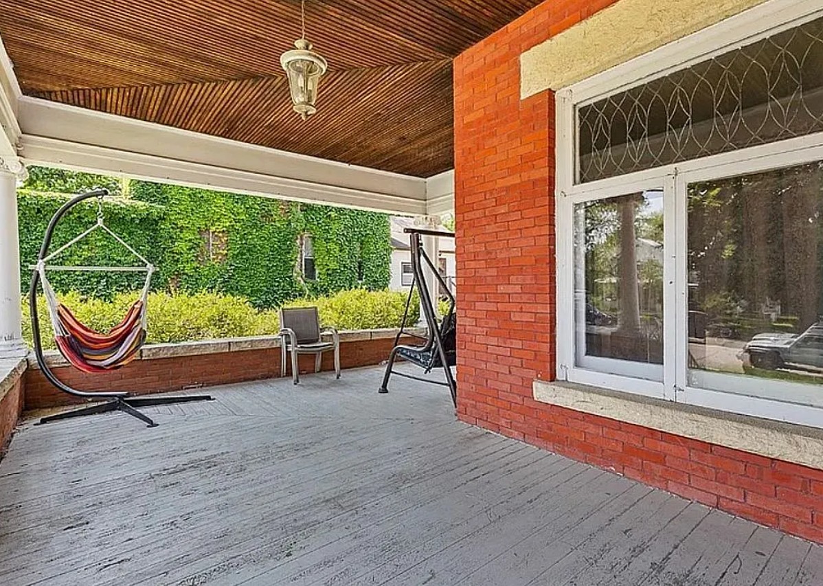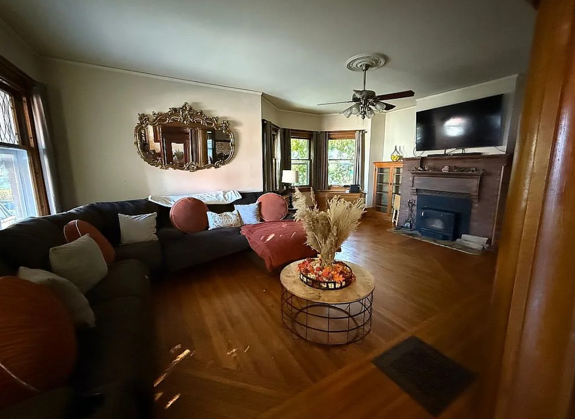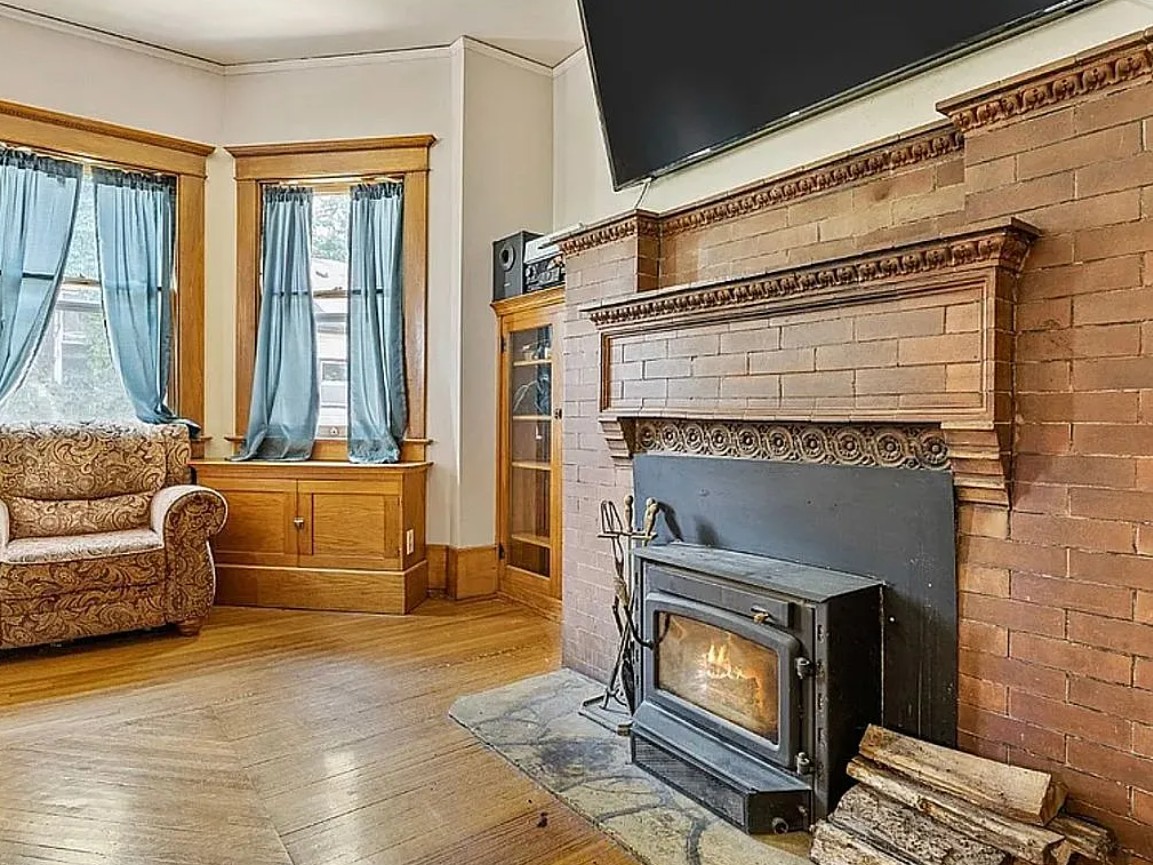 Inside, the home boasts rich, detailed woodwork, soaring ceilings, and original hand-laid hardwood floors that exude character and warmth.