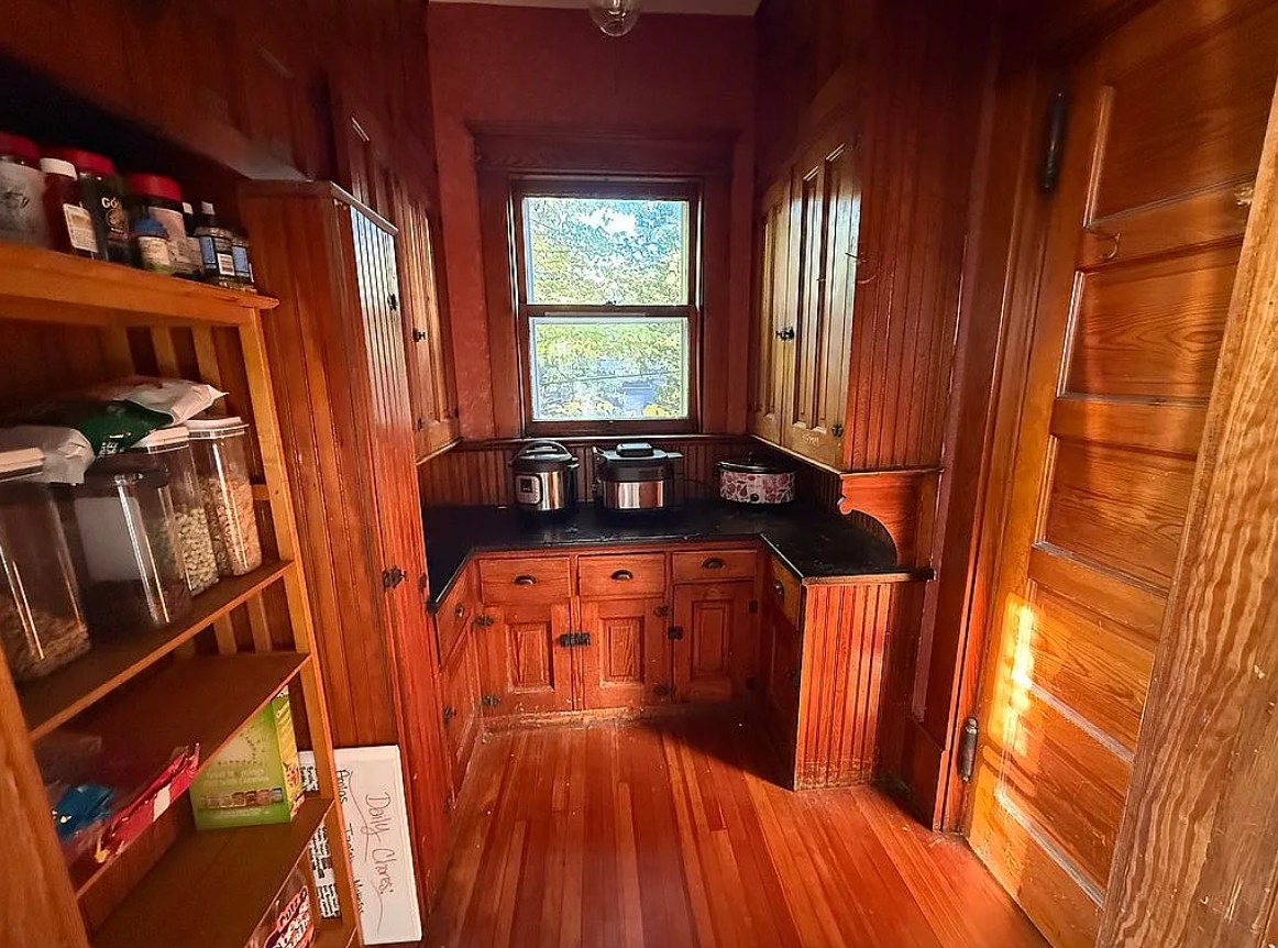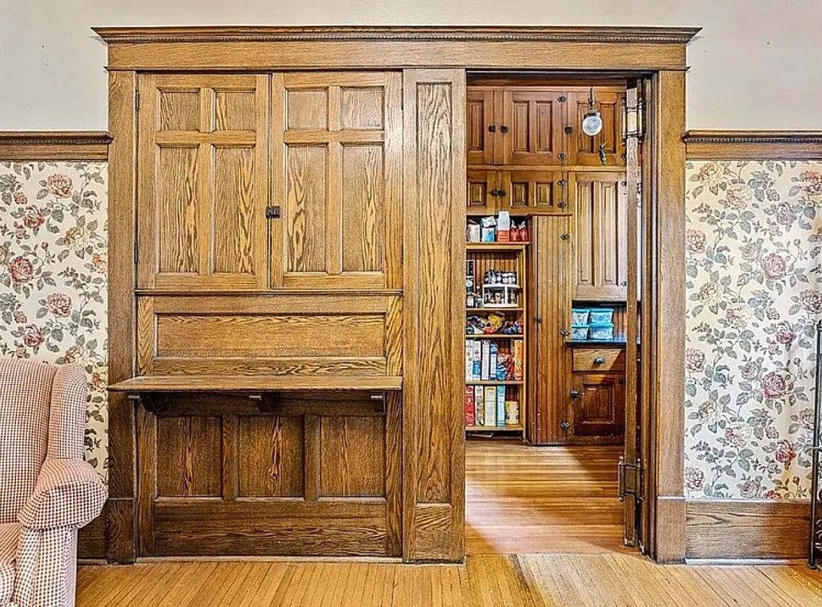 Additional features include pocket doors, original wood-carved doors, and a butler’s pantry with swinging doors.