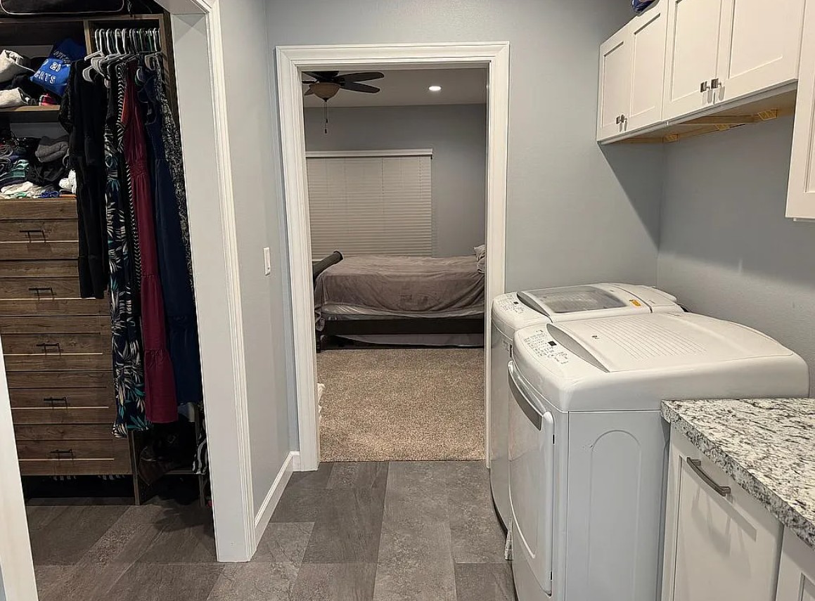 The primary suite includes a walk in closet, attached bath, and convenient main-floor washer and dryer.