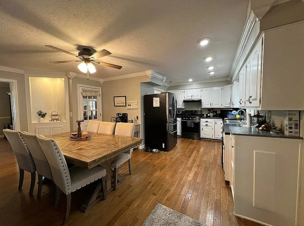 The home features a bright open layout connecting the kitchen and living room, along with a dedicated dining room that can easily serve as a family room or home office.