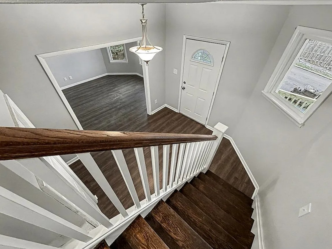 Large windows bring in abundant natural light, while the upstairs bedrooms offer spacious layouts and scenic views.