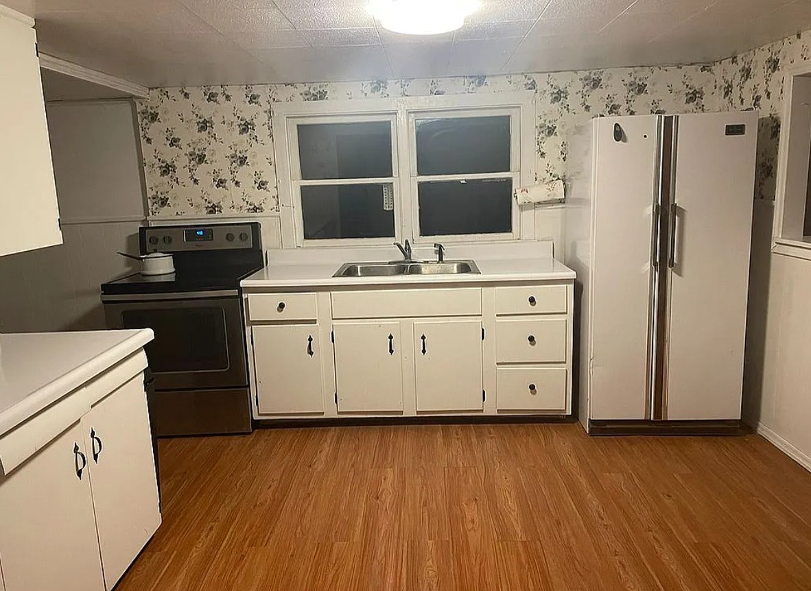 The property features a spacious living room with a large picture window, a cozy hearth, a functional kitchen with stove and refrigerator, and a dedicated dining room.