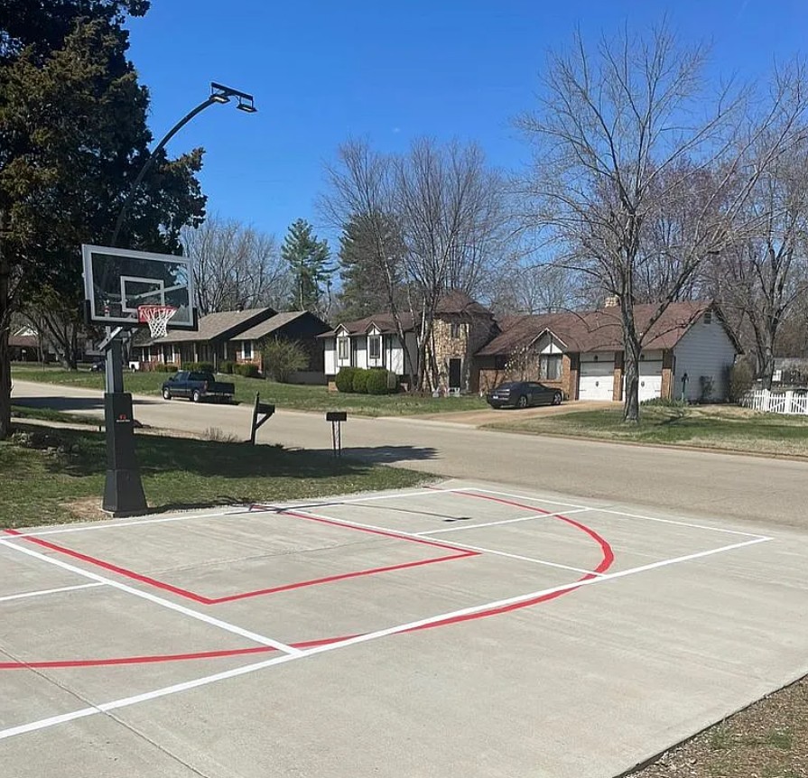 The large driveway features a professional basketball goal with lighting perfect for recreation.