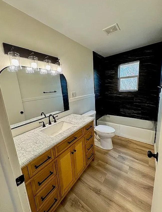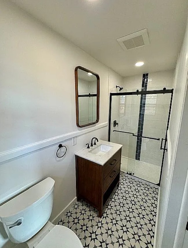 Back inside, the fully renovated hall bathroom serves Bedrooms 1 and 2, while the primary bedroom offers its own updated en-suite bath and plenty of windows.