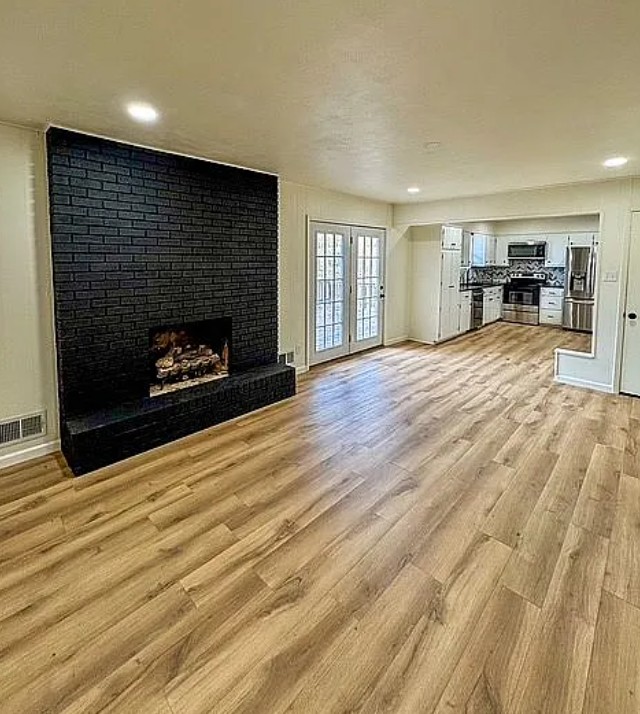 The living space flows into a cozy family room with a large fireplace and an open-concept connection to the updated kitchen, creating an ideal layout for everyday living and entertaining.