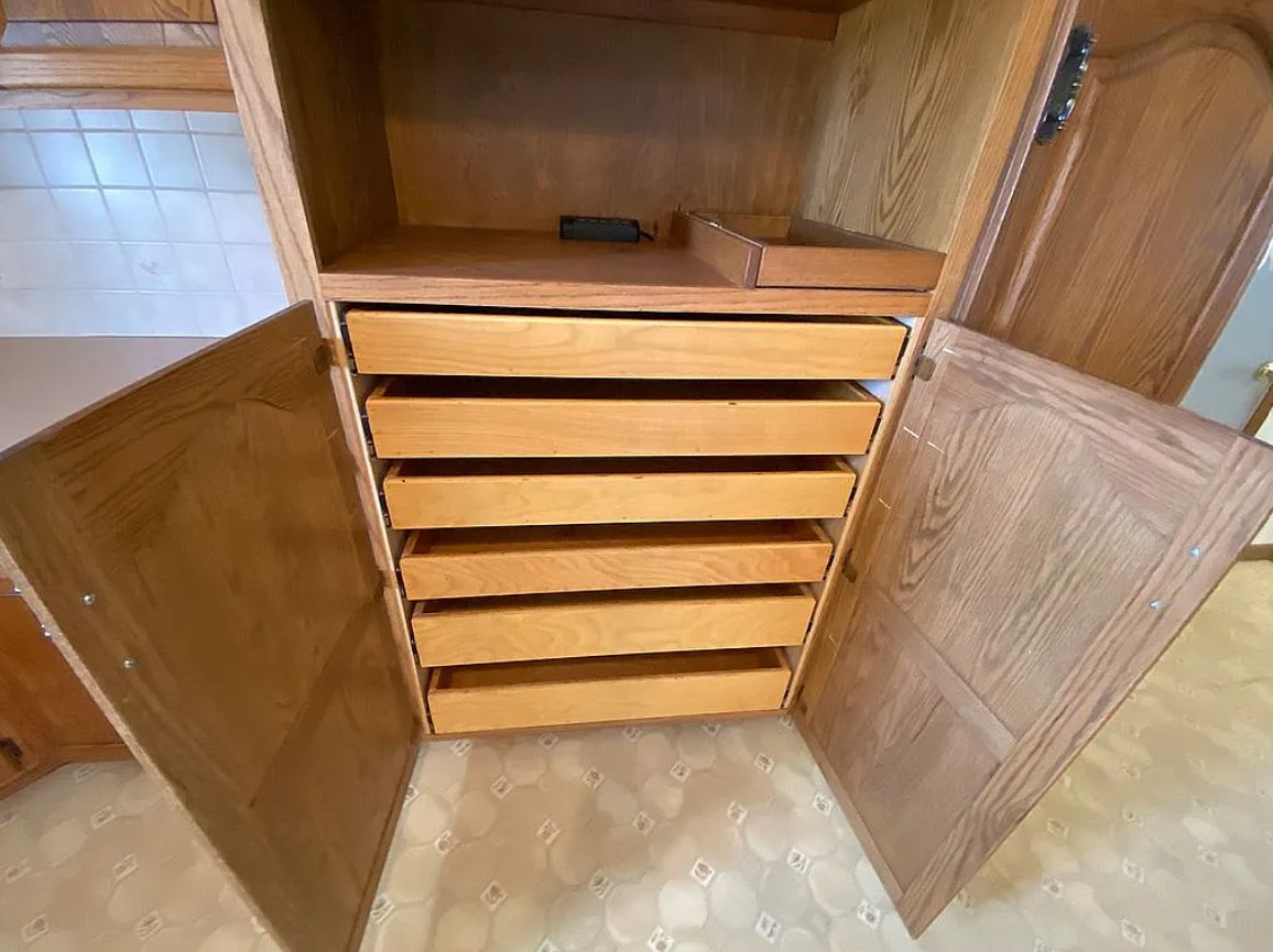 This spacious farmhouse features an open kitchen and living area perfect for family gatherings and a custom kitchen with pull-out shelving.