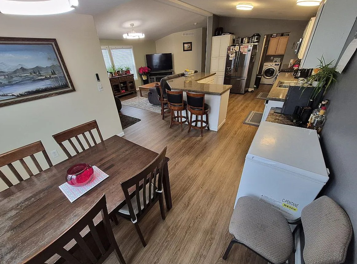 The spacious kitchen and dining area feature an open floor plan with abundant natural light from large windows, creating a bright and welcoming atmosphere.