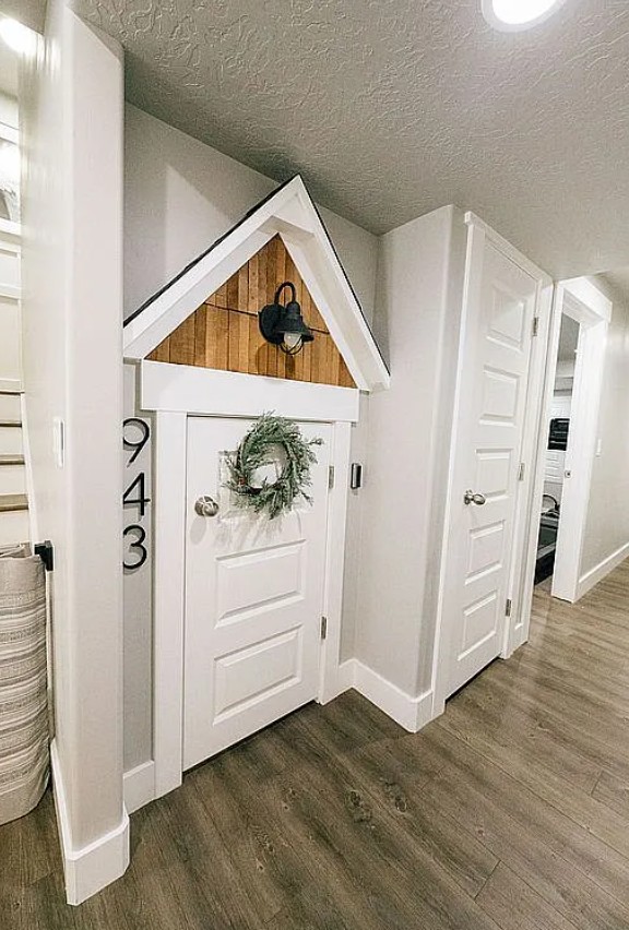 The custom finished basement offers a perfect mother-in law suite with its own entrance, an open living area, custom wainscoting, a kitchenette with quartz countertops, a built in bar, a large bedroom, full bathroom, and cold storage.