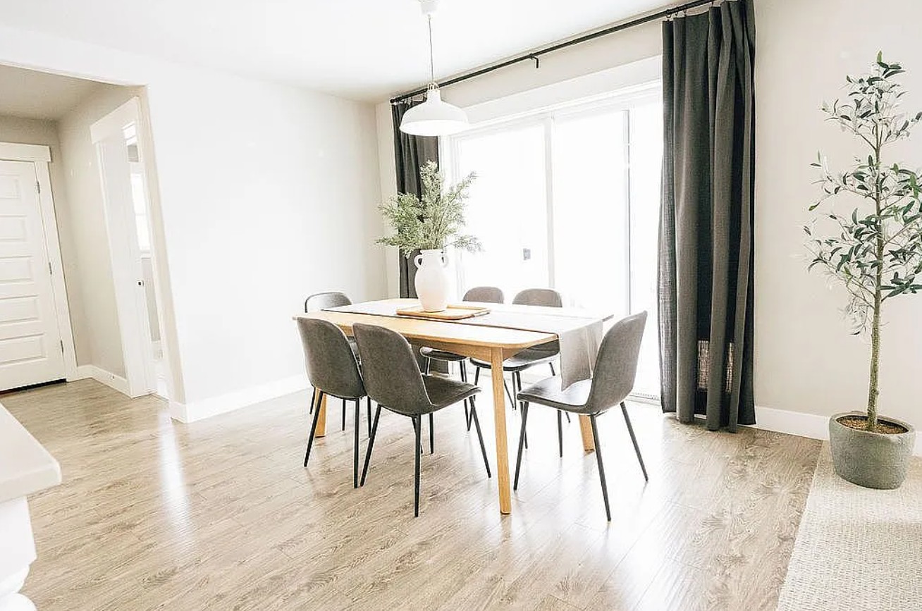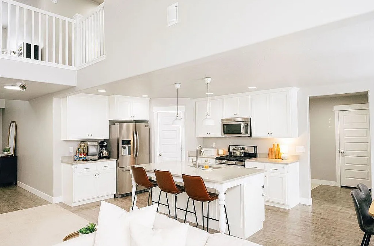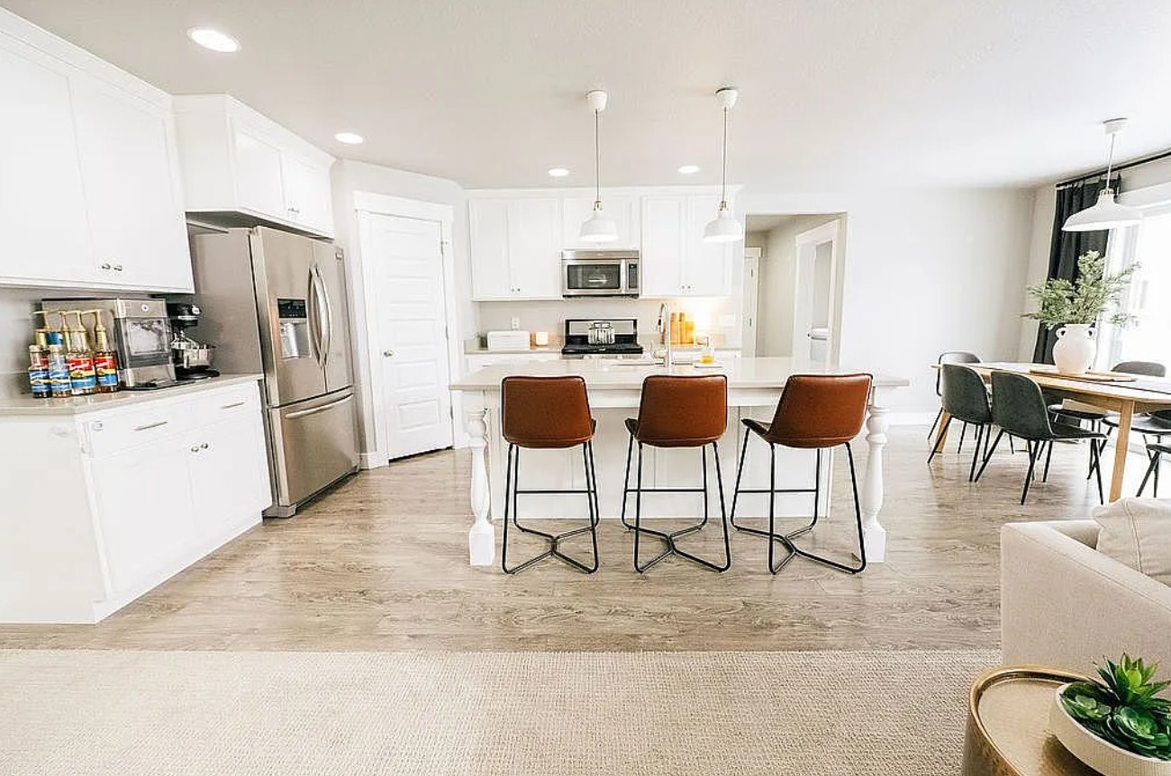 A beautiful kitchen with a large island, corner pantry, and spacious dining area sits just off the main living space.
