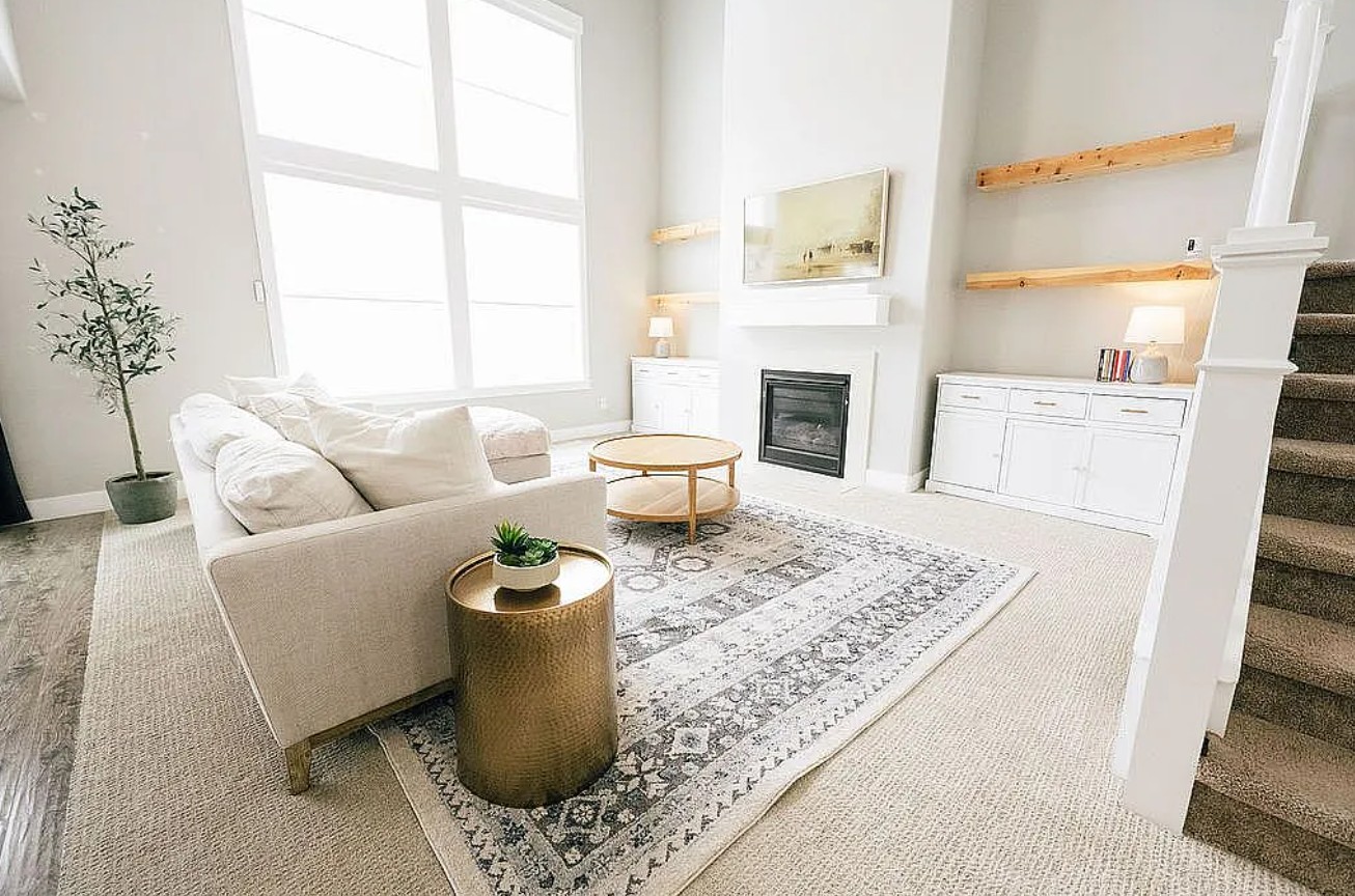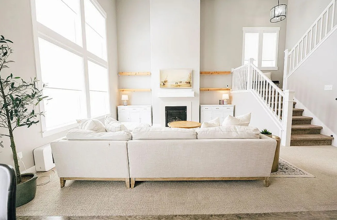 Step inside to a bright great room style living area featuring 18 foot ceilings, expansive windows with motorized blinds, and a cozy gas fireplace that fills the home with natural light.