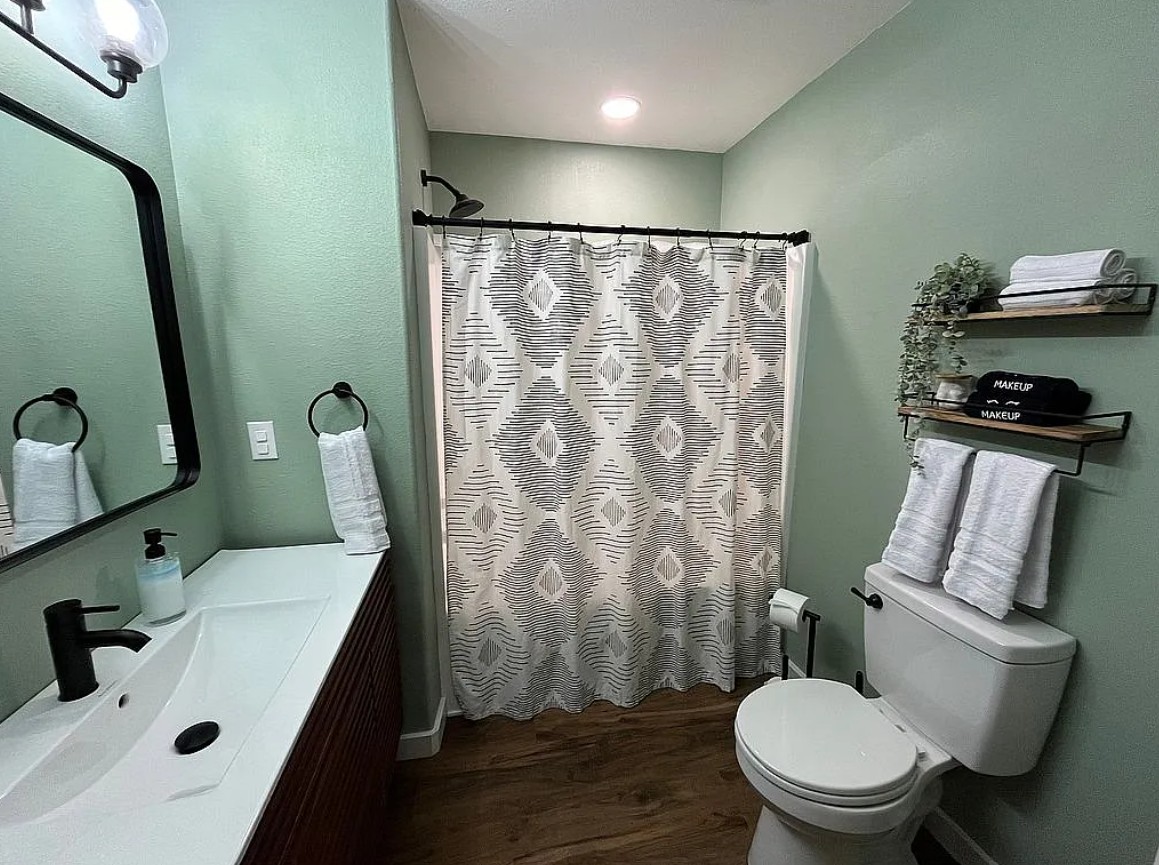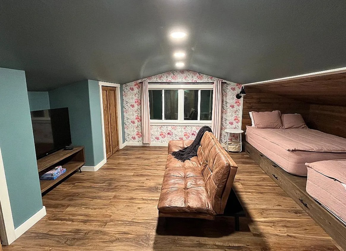 Upstairs, you’ll find a movie/lounge room, desk space, half bath, and a large bedroom.