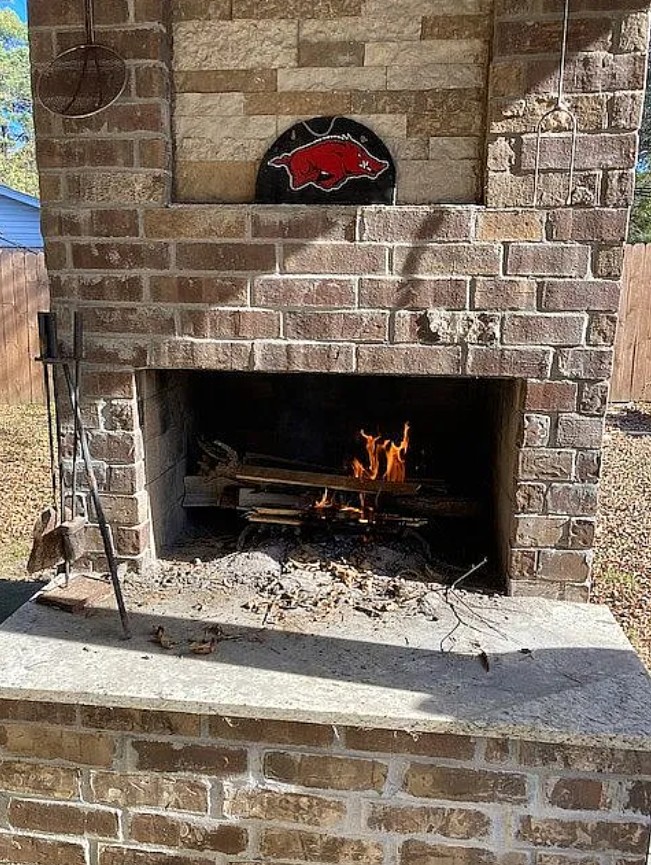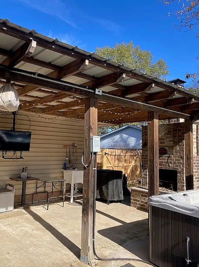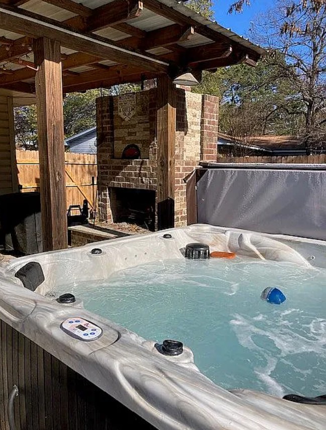 The spacious backyard and patio include an outdoor wood fireplace, TV setup, and a new hot tub (2024) perfect for relaxing or entertaining.