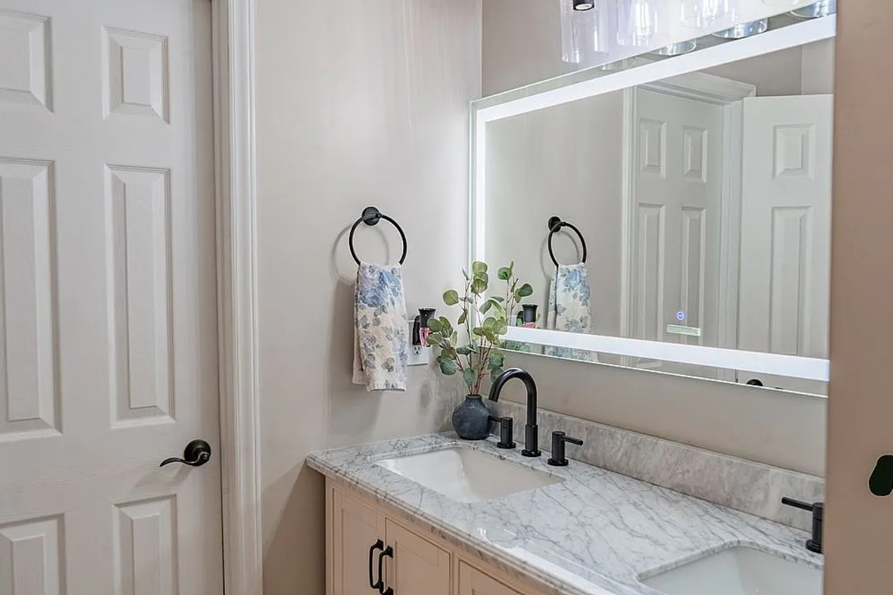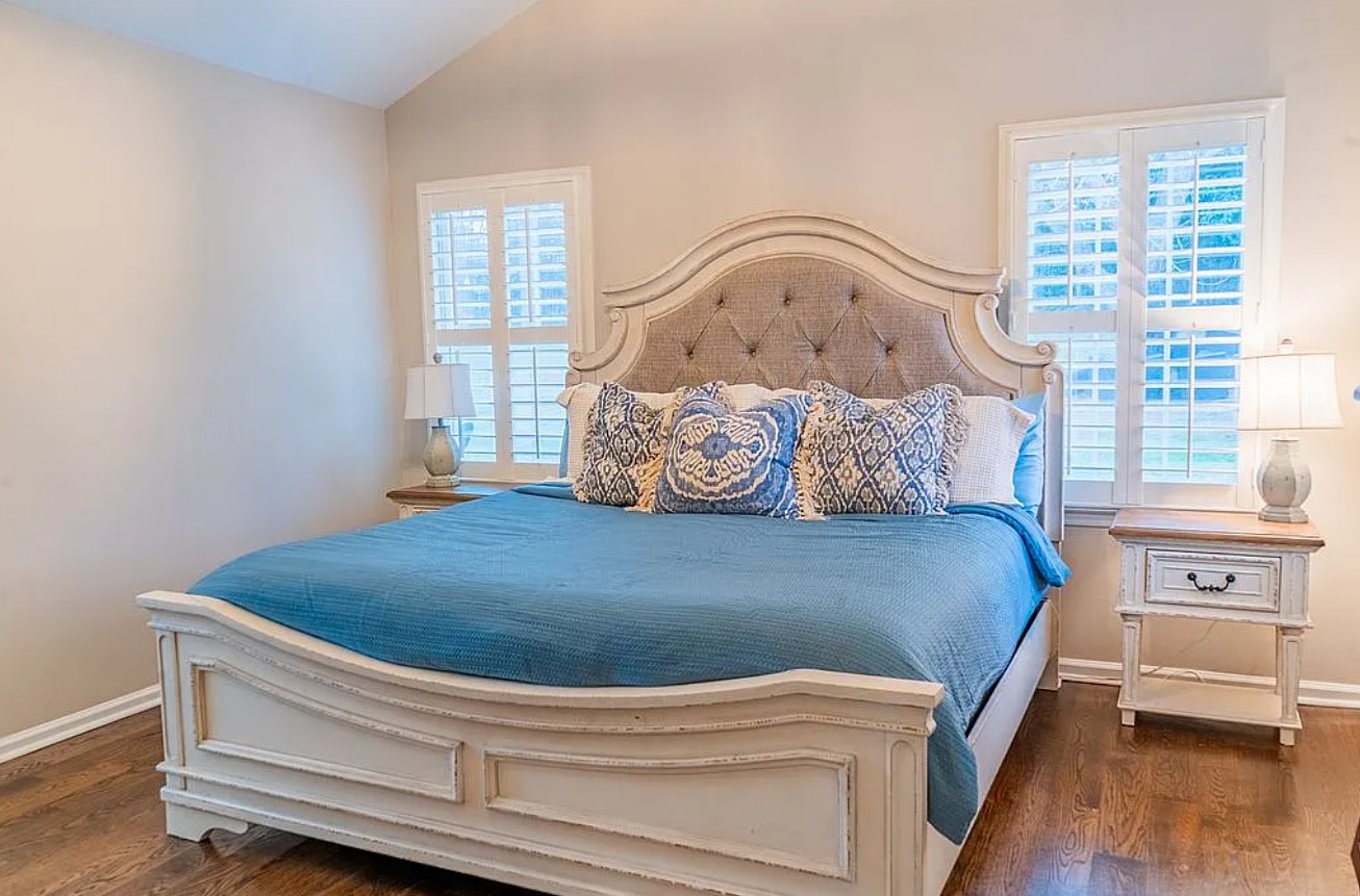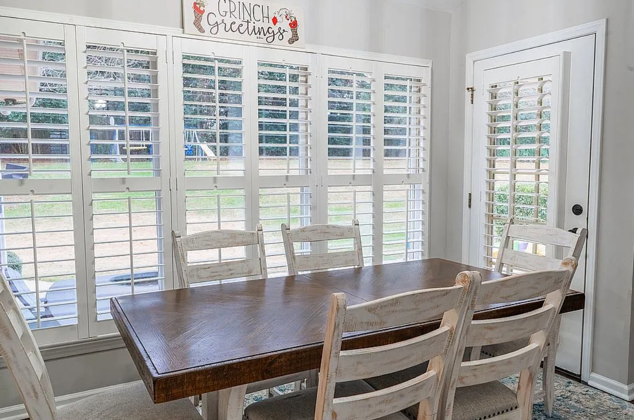 The master bathroom was fully remodeled in 2025 with sleek, contemporary finishes, and every room benefits from updated light fixtures and elegant plantation shutters (2023) for a classic, clean look.