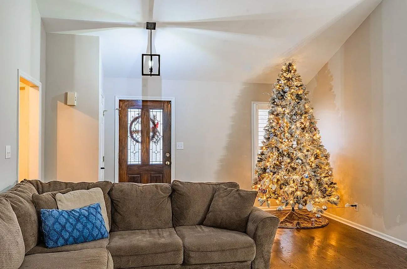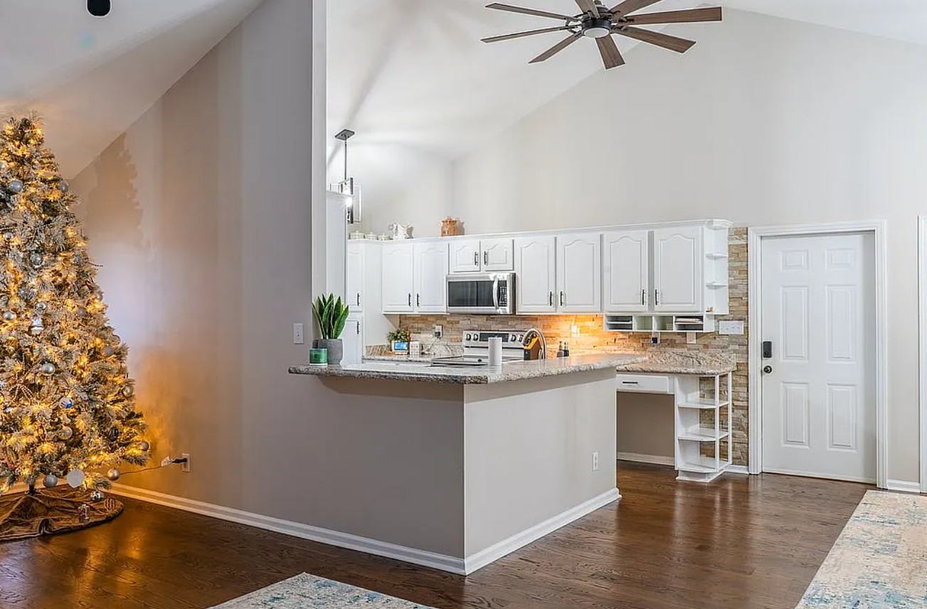 Vaulted ceilings in the living room, kitchen, and master bedroom create an open and airy feel, while the newly installed hardwood floors (2023) add warmth and sophistication.