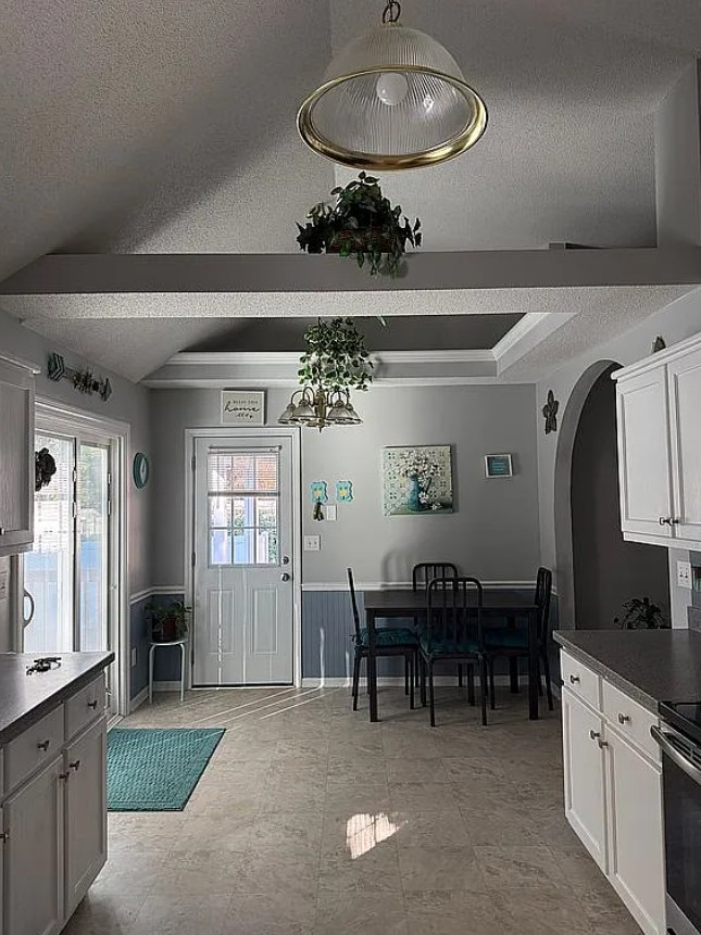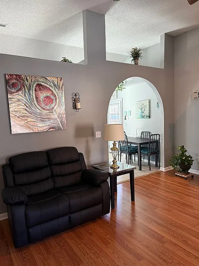 A decorative archway leads from the living room to the kitchen, adding character to the open layout.