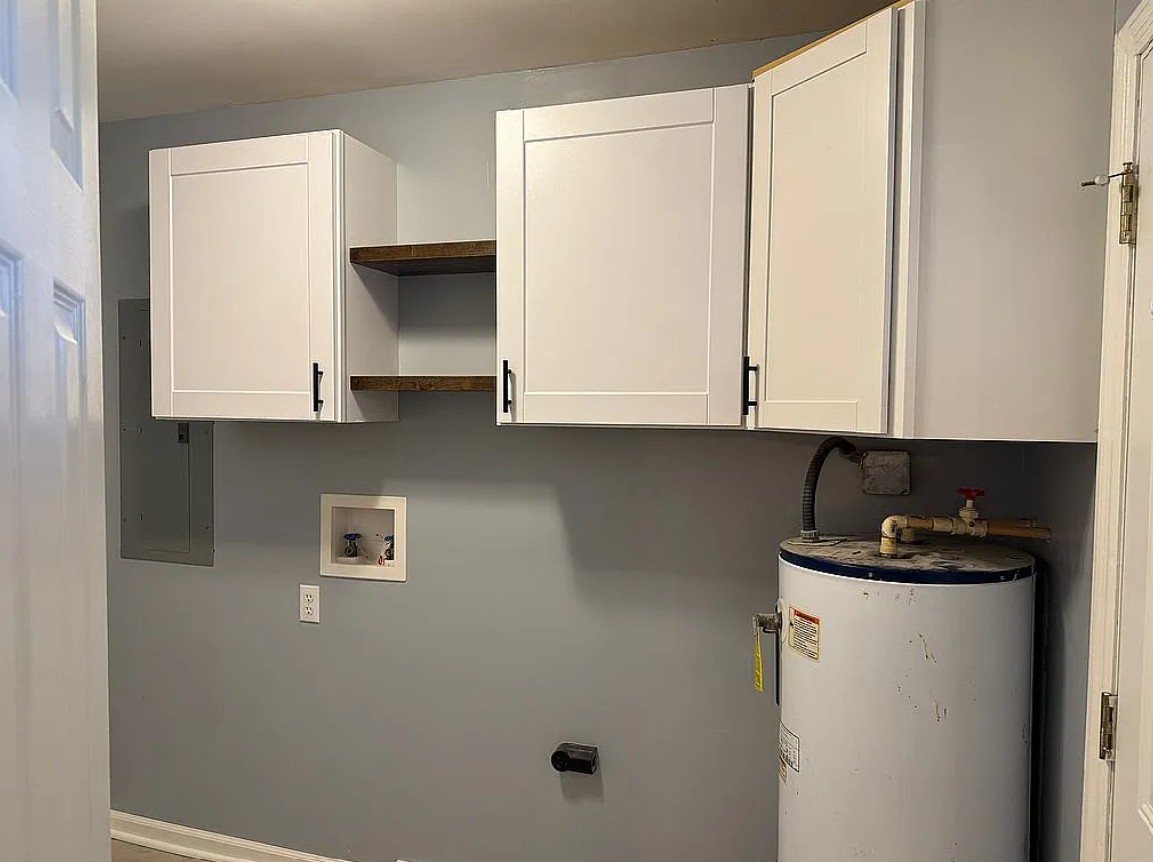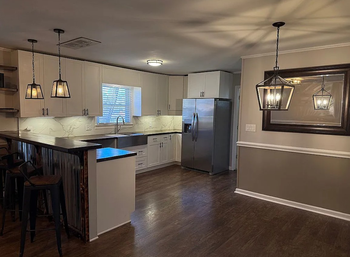 The fully updated kitchen features new shaker cabinets with ample storage, butcher block countertops, under cabinet lighting, and new stainless appliances.
