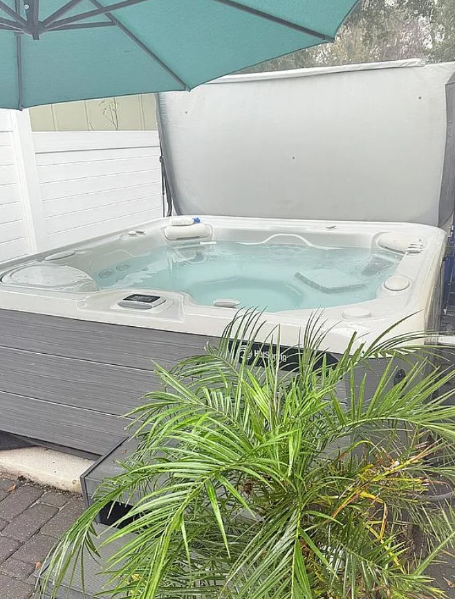 Outdoor living is designed for enjoyment of the Lowcountry lifestyle, including a screened porch, a stone patio, and a Hot Springs saltwater hot tub with added privacy fencing.