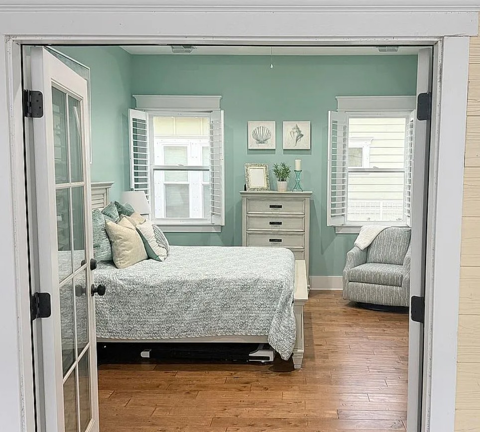 This oversized room also includes a custom barn-door closet and a spacious bathroom with dual granite vanities and a privacy door separating the shower, tub, and toilet area—perfect for guests, teens, or a home office.