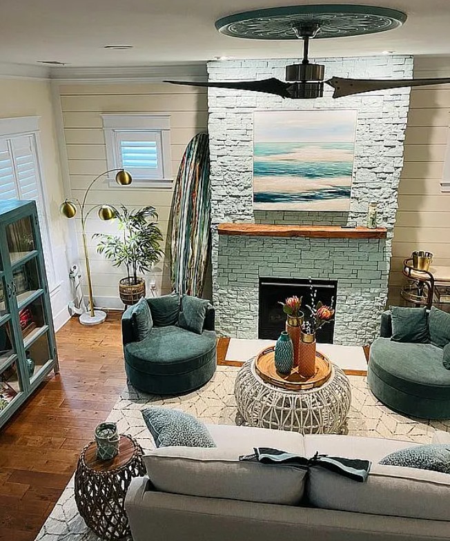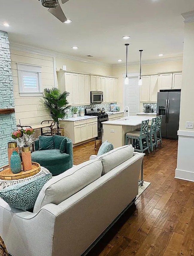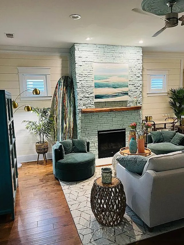 The kitchen flows seamlessly into the living area, highlighted by a stacked-stone gas fireplace framed with shiplap, creating a warm and inviting focal point.