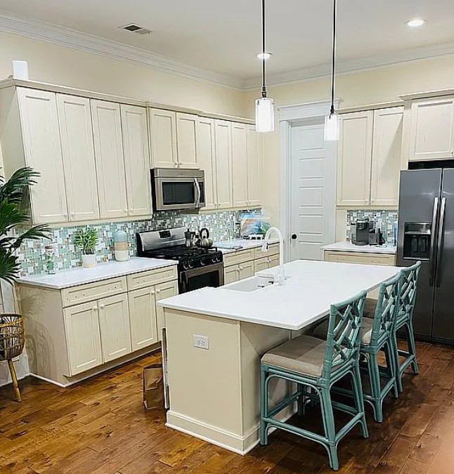 The gourmet kitchen is a standout feature, offering quartz countertops, a striking glass-tile sea glass backsplash, stainless steel appliances, seating at the island, and a large walk-in pantry, making it perfect for entertaining or family gatherings.