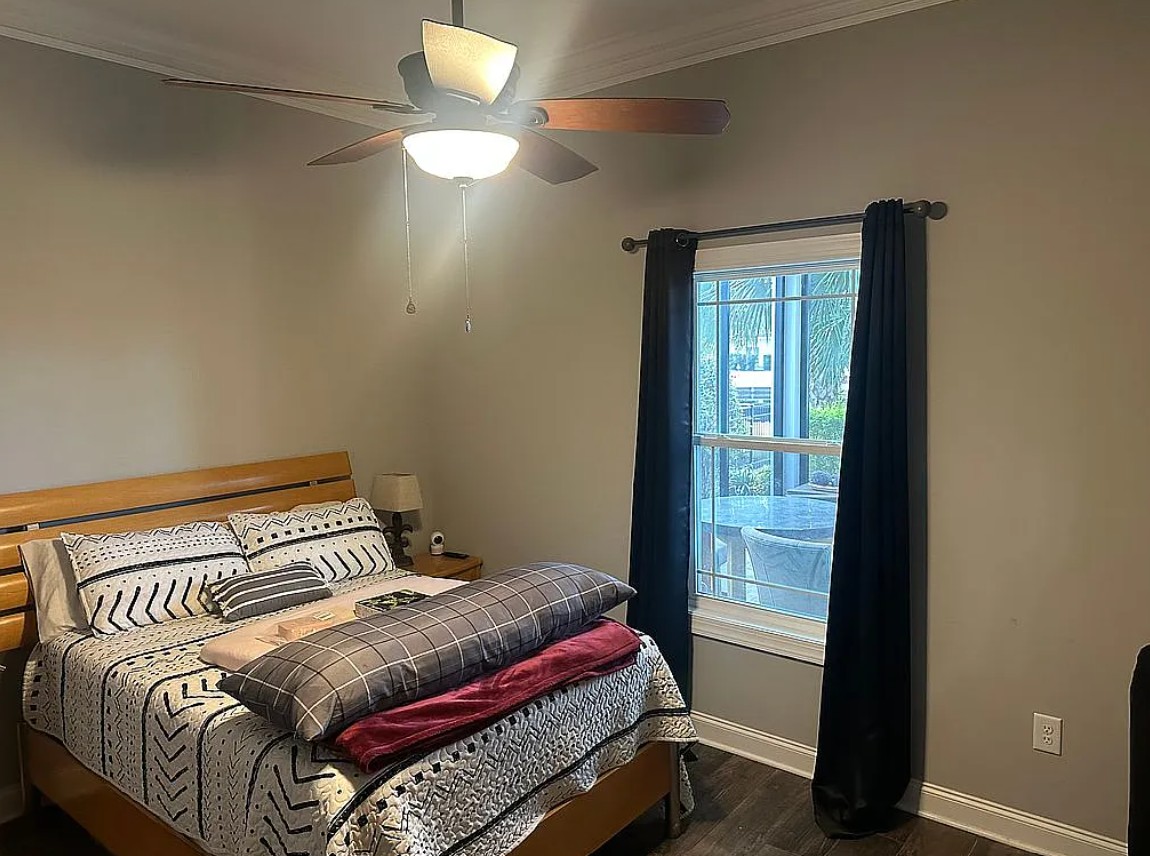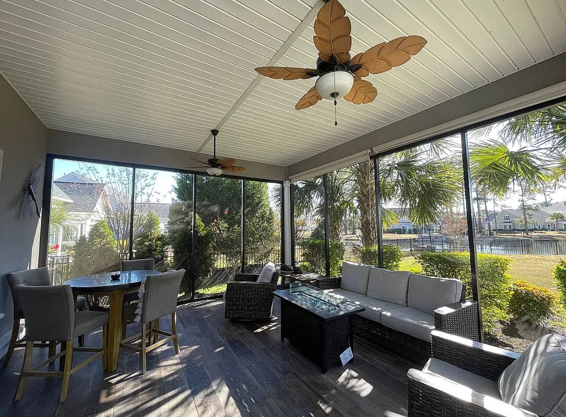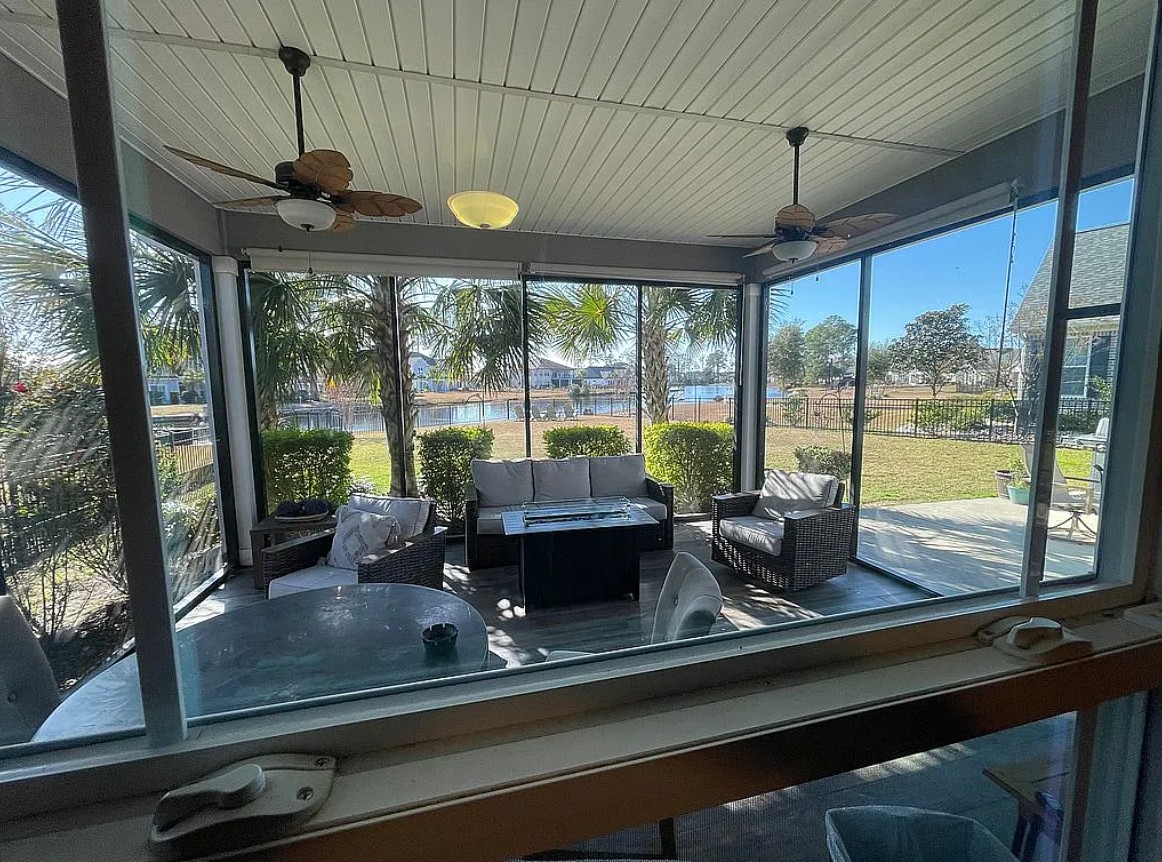 The Carolina room overlooks the backyard and leads to a screened in lanai with electricity for outdoor TV and ceiling fan, offering the perfect spot to relax while enjoying peaceful lakefront views.