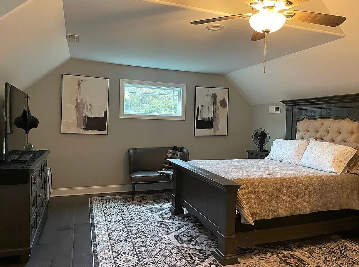 Large windows in the front dining room provide picturesque views of the yard, while upstairs, an above-garage bedroom includes its own full bathroom and access to the attic.