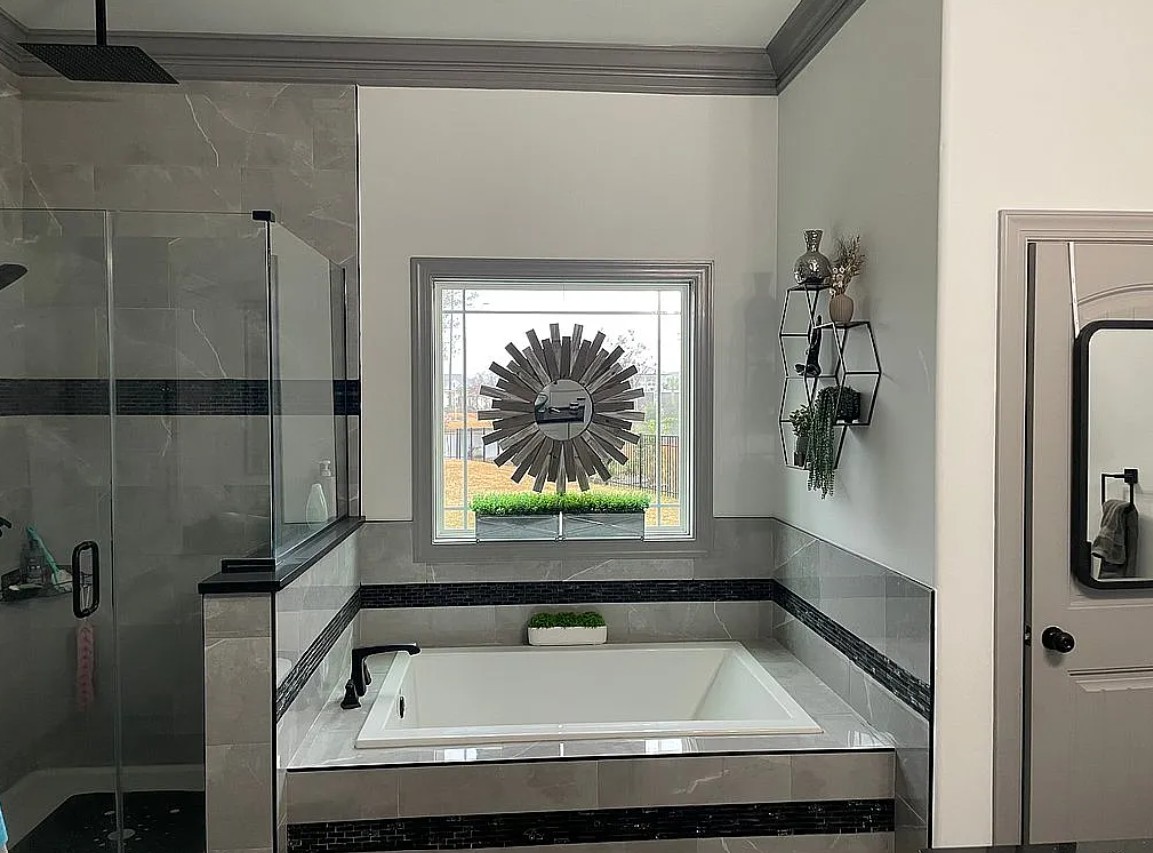 The master suite is a true retreat, complete with His and Hers walk in closets, a soaker tub with serene lake views, double vanity sinks, a stand-up shower, and a private toilet room.