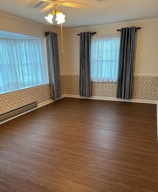 The home is equipped with natural gas, including a gas water heater and a small kitchen wall heater, in addition to a full HVAC unit.
