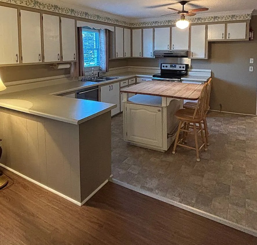 This beautifully maintained brick home for sale by owner (FSBO) featuring an open-concept family area and a spacious eat-in kitchen equipped with a range with hood, Bosch dishwasher, and a large island counter with barstools perfect for cooking and gathering.