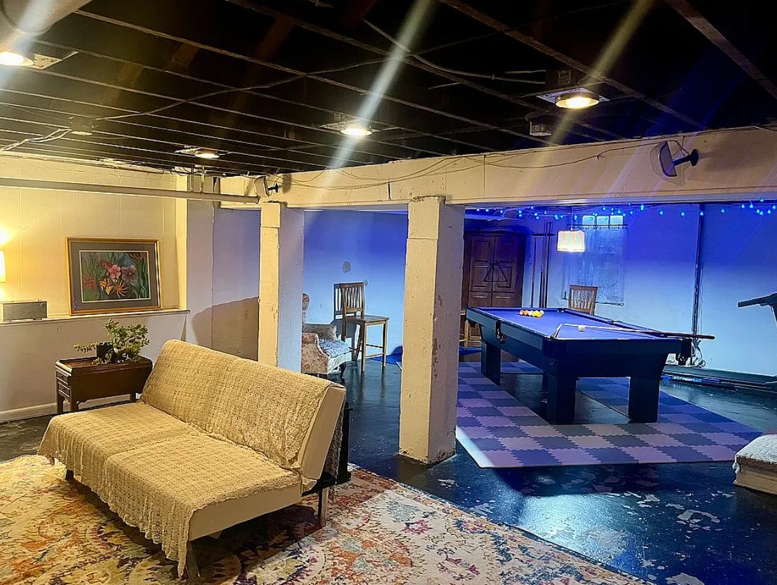 The spacious finished basement is ideal for a game room, movie nights, or sleepovers.