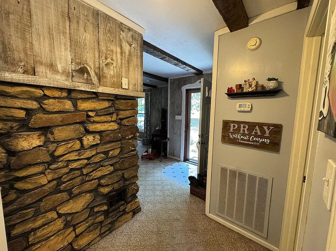 Inside, you’ll find a cozy living space highlighted by gas logs and a custom-built stone fireplace, creating warmth and comfort year-round.