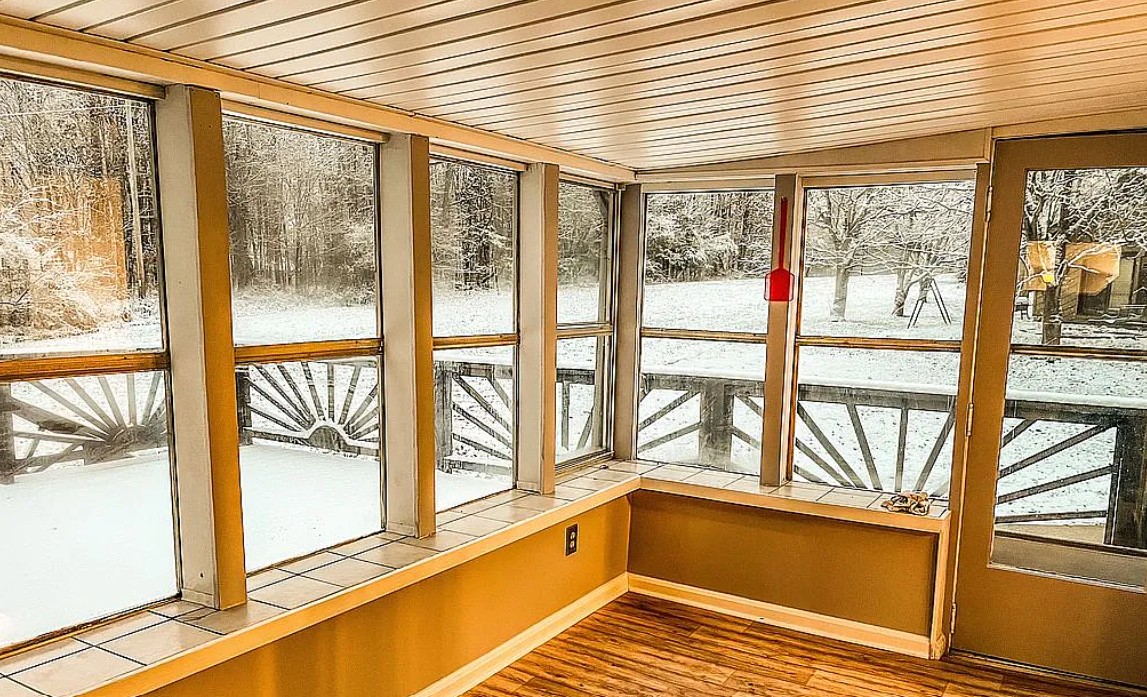 The open-flow kitchen and dining area easily accommodate a table seating up to 10 guests, while the adjacent sunroom provides additional dining or lounging space filled with natural light.