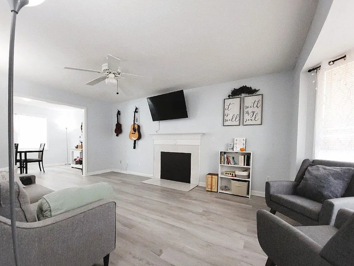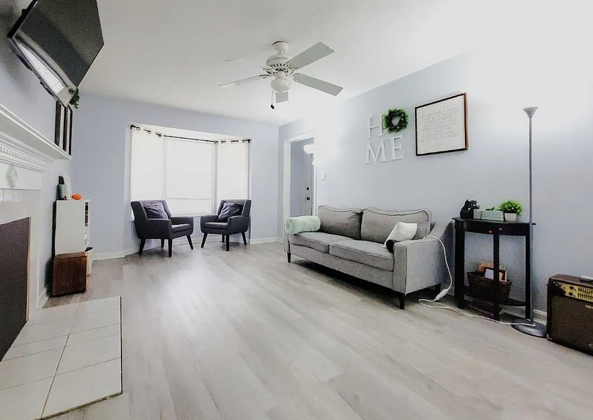 The living room showcases a charming bay window and a wood-burning fireplace, creating a warm and inviting atmosphere.