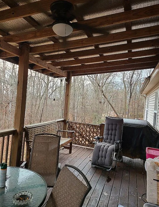 Enjoy outdoor living on the large covered back porch overlooking a wooded backyard, offering privacy and a peaceful setting.