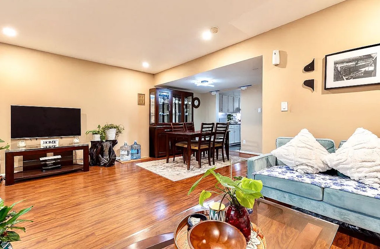 The spacious living room is ideal for entertaining and opens through sliding glass doors to a private fenced-in patio, perfect for grilling, relaxing, and enjoying quick access to the pool and clubhouse just steps away.