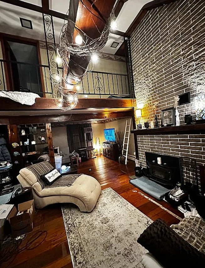 Hardwood floors flow throughout the main living areas, including a fireplace sitting area with an adjacent second seating space, perfect for family gatherings or relaxing evenings.