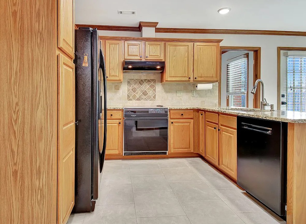 The updated kitchen includes granite countertops, new hardware, and an eat-in dining area overlooking the beautifully landscaped backyard, creating a peaceful and private setting.
