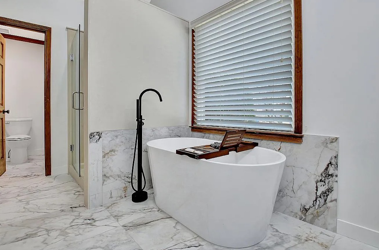 The primary suite features an upgraded, spa-like bathroom and a custom closet.