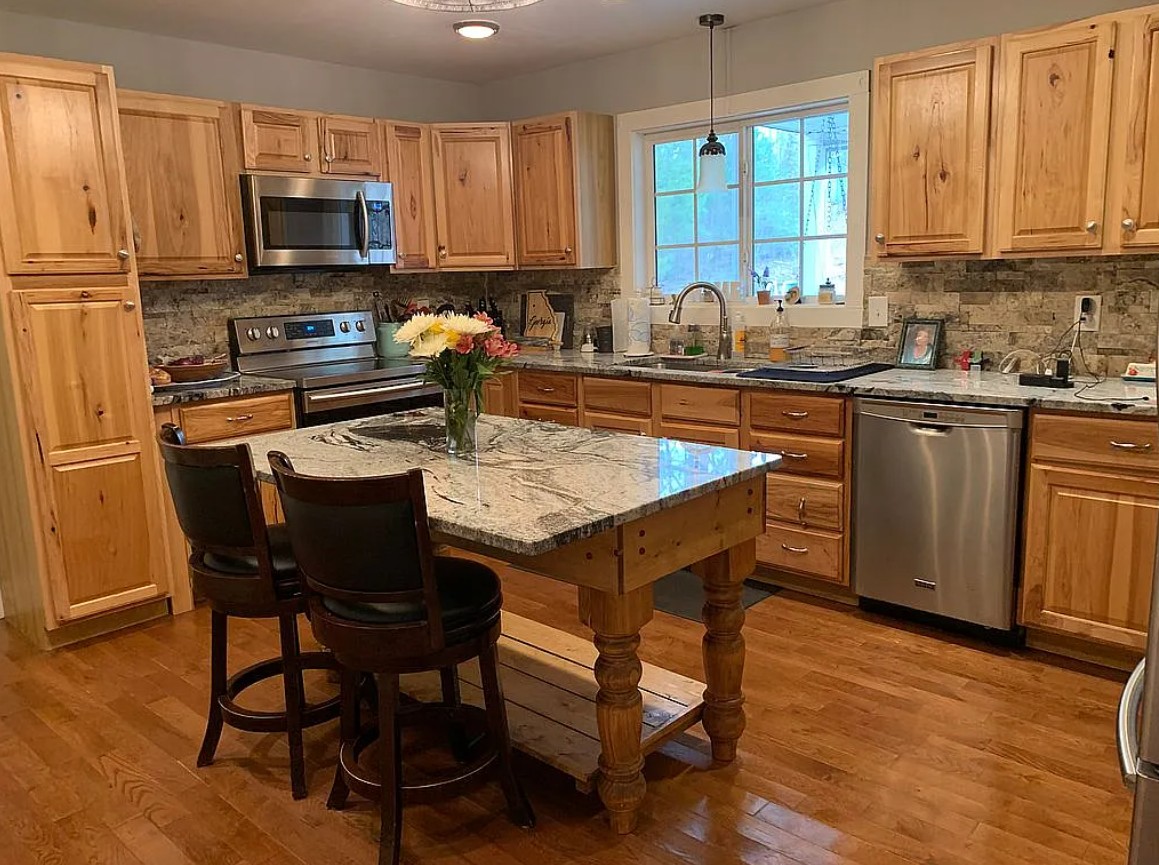 The remodeled kitchen boasts granite countertops, a large island, brand-new appliances, and a smart refrigerator.