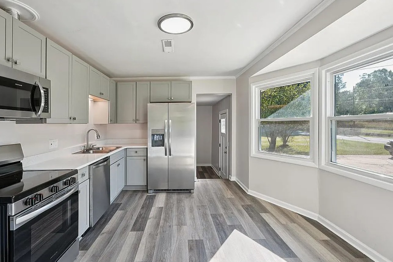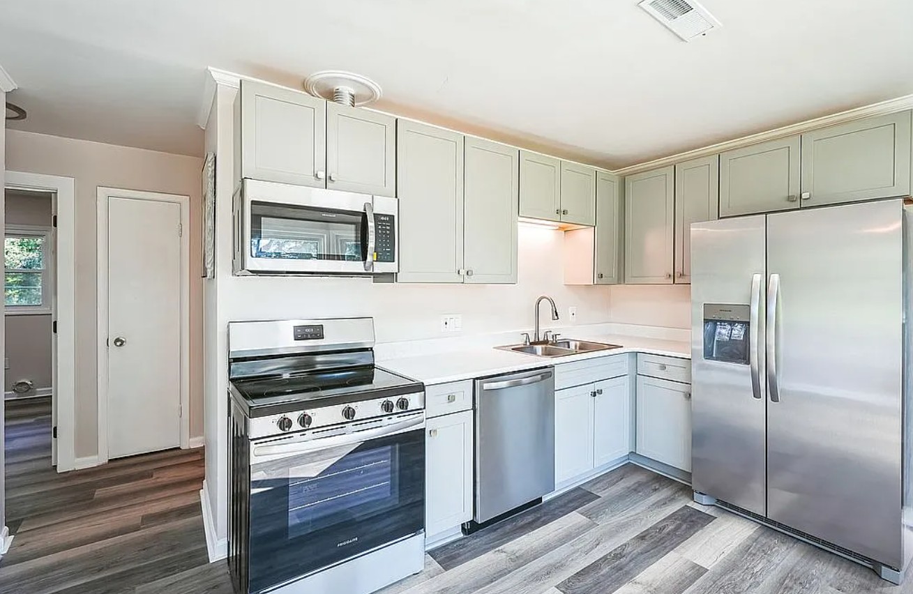 The kitchen is equipped with new modern appliances, including a refrigerator, electric range, dishwasher, and microwave, making meal preparation easy and efficient.