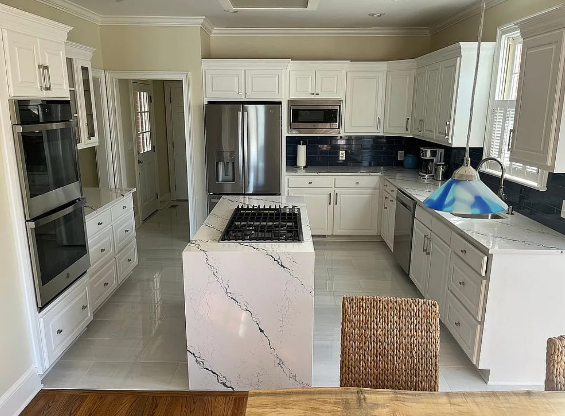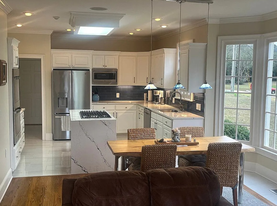 The updated kitchen offers a breakfast area and sitting space with a second fireplace, combining function and style.