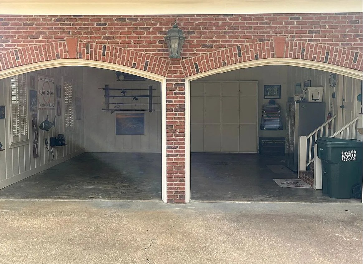The property also offers under-house golf cart storage, a two-car garage with custom cabinets, and a large area beneath the home suitable for a workshop or additional storage.